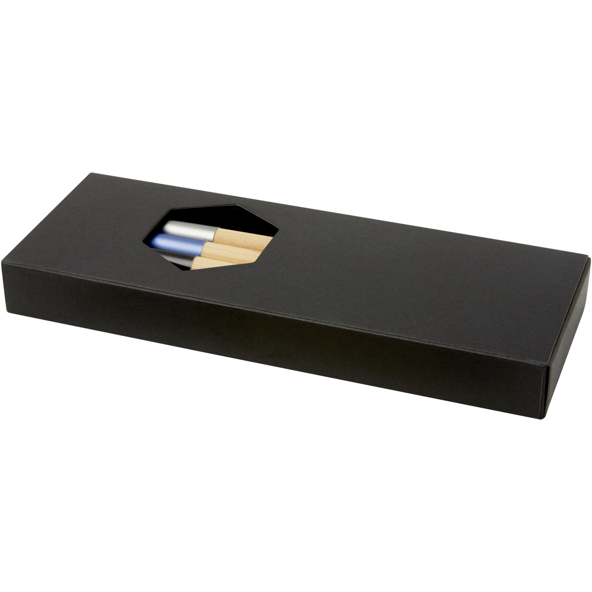 Upeasti muotoiltu kuulakärkikynäsarja, jossa on kolme värikorostuksella varustettua kuulakärkikynää. Tämä sinisellä alumiinilevyllä varustettu kuulakärkikynä on esitäytetty sinisellä värillä, ja loput kaksi on esitäytetty mustalla värillä. Pakattu mustaan lahjapakkaukseen.