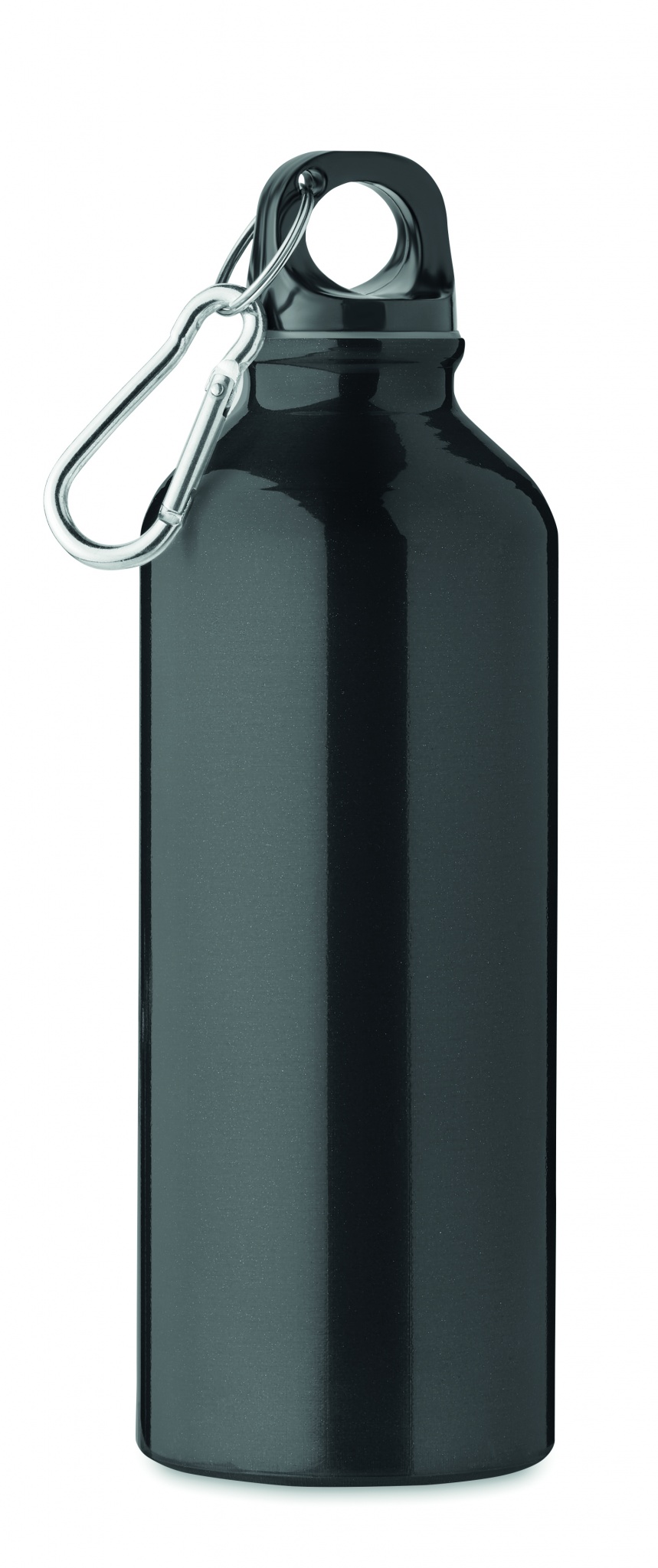 Kierrätetystä alumiinista valmistettu yksiseinäinen juomapullo karabiini lenkillä mukautettavalla painatuksella, Musta