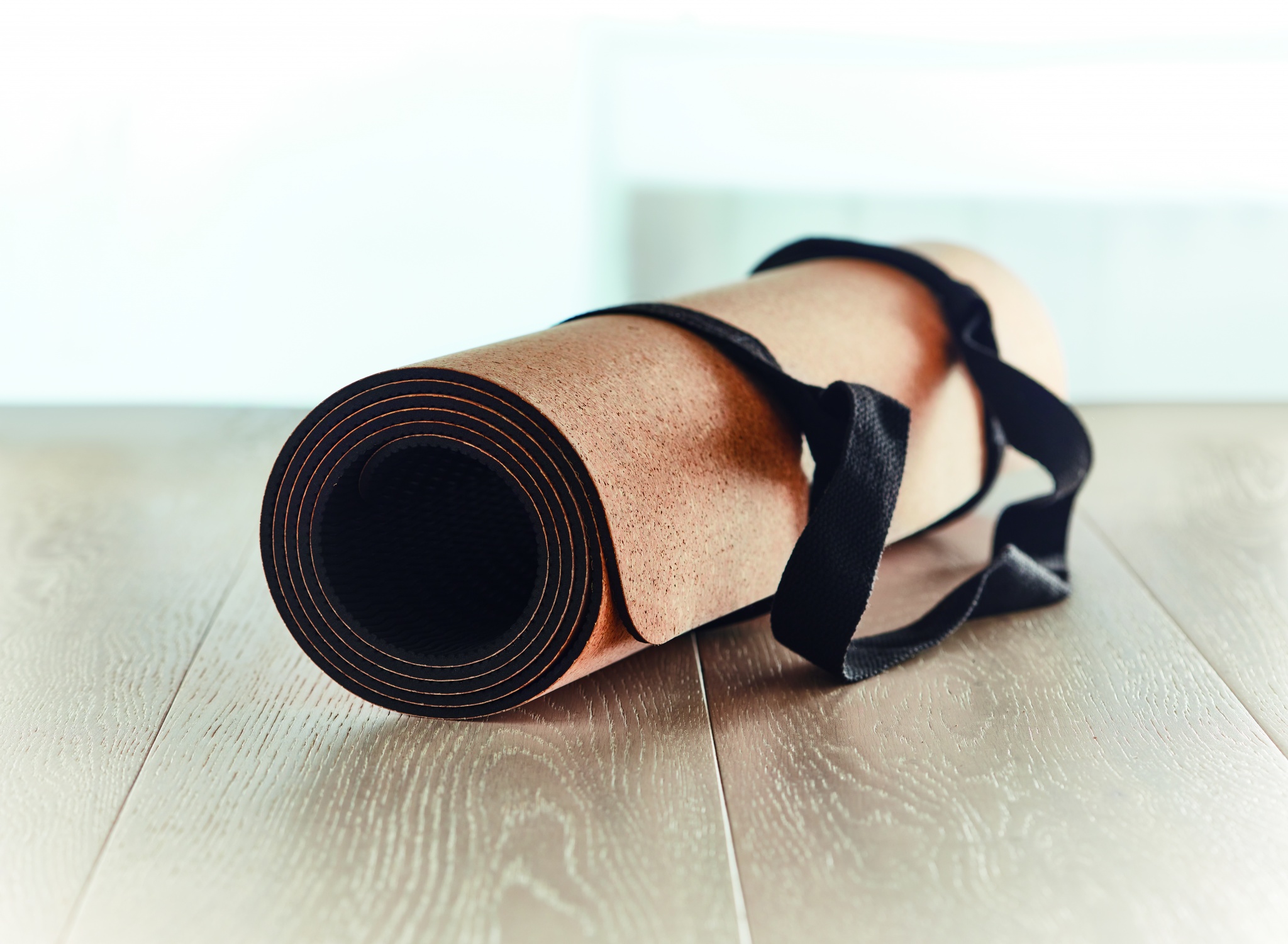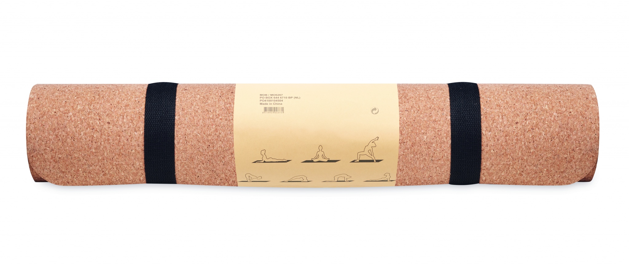 Korkki joogamatto pakattuna paperiseen kääreeseen, paksuus 0,4 cm. Sisältää puuvilla hihnan, maton kantamiseen. Korkki on luonnonmateriaali, strukturaalinen laatu ja pinnan huokoisuus voi aiheuttaa eroavaisuuksia tuotteissa painatuksen jälkeen