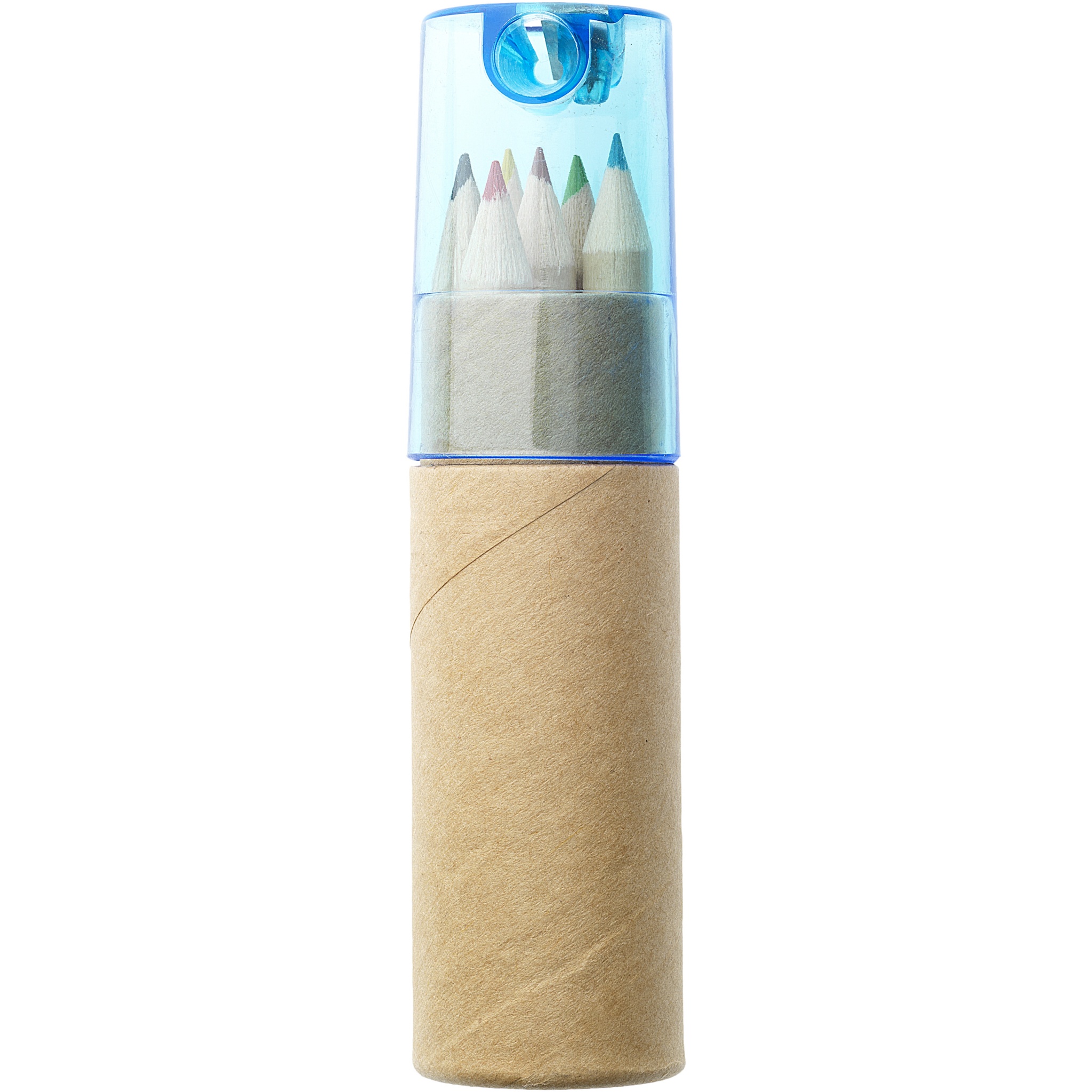 6 värikynää pahvilaatikossa. Teroitin muovikannen sisällä. Painatus ei mahdollinen eri osiin.