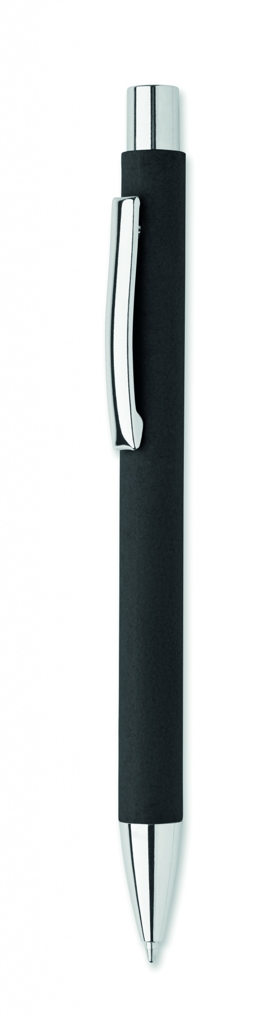 Kierrätyspaperista valmistettu painonappikuulakärkikynä, jossa on metallinen kärki ja klipsi. Sininen muste.