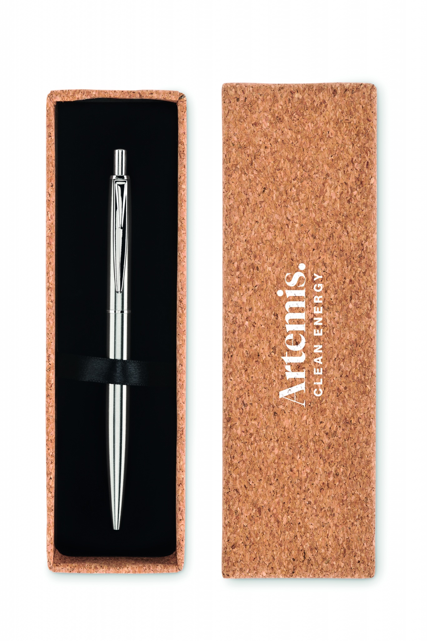 Kierrätetystä, ruostumattomasta teräksestä valmistettu kuulakärkikynä sinisellä musteella. Toimitetaan korkista tehdyssä rasiassa. Korkki on luonnonmateriaali, strukturaalinen laatu ja pinnan huokoisuus voi aiheuttaa eroavaisuuksia tuotteissa painatuksen jälkeen
