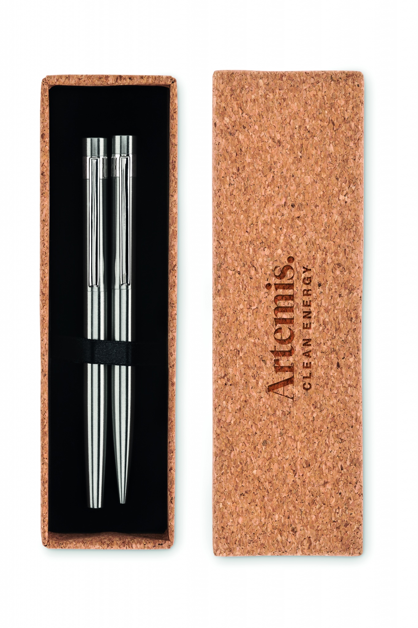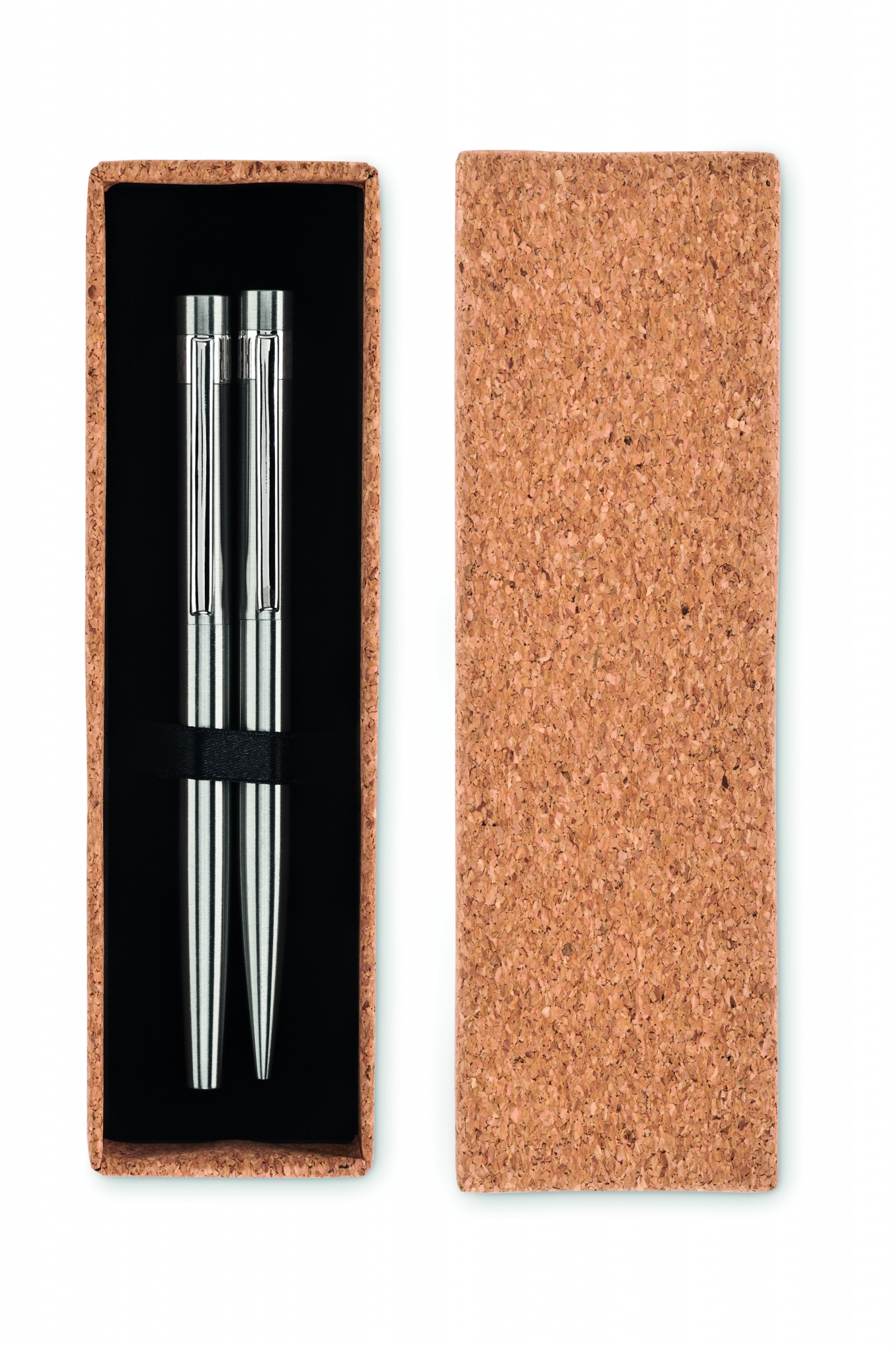 Kierrätetystä, ruostumattomasta teräksestä valmistettu kynäsetti, jossa on kuulakärkikynä ja rollerball-kynä. Toimitetaan korkista tehdyssä rasiassa. Sininen ja musta muste. Korkki on luonnonmateriaali, strukturaalinen laatu ja pinnan huokoisuus voi aiheuttaa eroavaisuuksia tuotteissa painatuksen jälkeen.