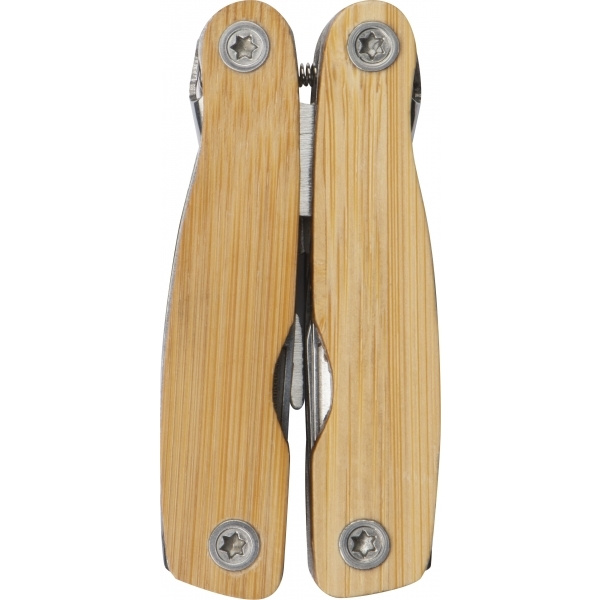 Ruostumattomasta teräksestä valmistettu monitoimityökalu bambukuorilla ja erilaisilla työkaluilla, kuten pihdit, veitsi, saha, ruuvimeisseli, viila jne. Logosi kaiverretaan kahvan toiselle puolelle.