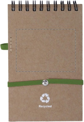 Kierrätetty muistikirja ja yhteensopiva kuulakärkikynä sinisellä musteella, sisältää 140 tyhjää kierrätettyä sivua (70 arkkia) kumilenkin ja kynän silmukan. Kynässä biohajoavat muovi osat ja kartonkinen runko.