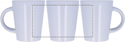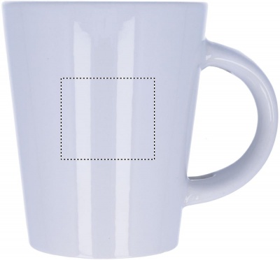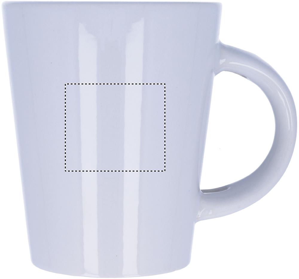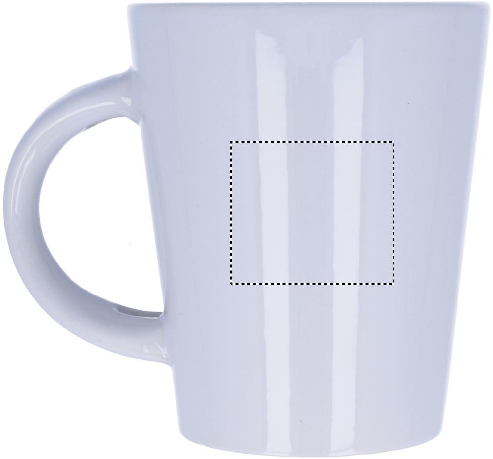 Kivitavara 300 ml muki erikoispinnoitteella sublimaatiopainatusta varten, sisältää lusikan kahvassa. Yksittäispakattuna valkoiseen pahvilaatikkoon.