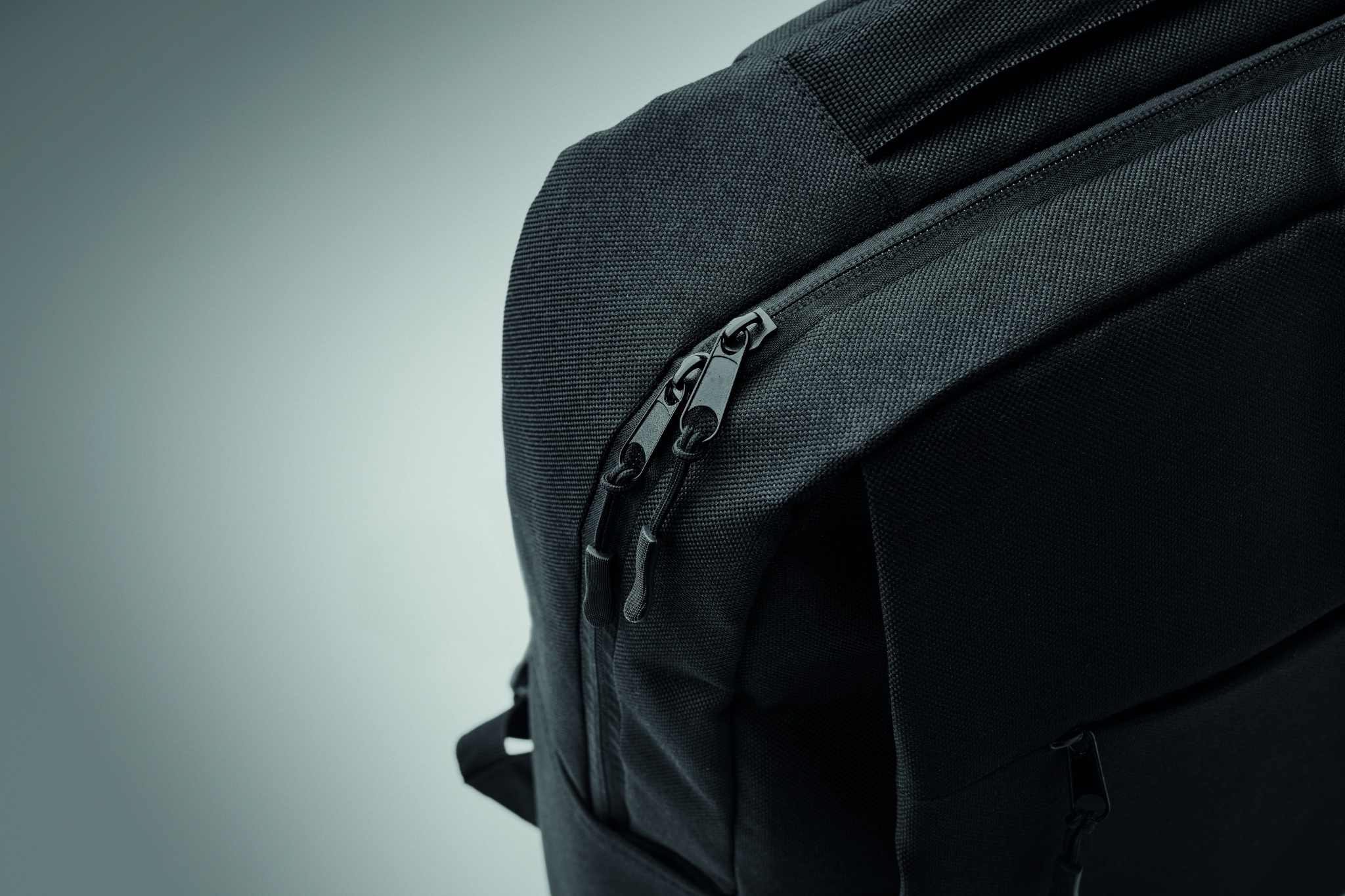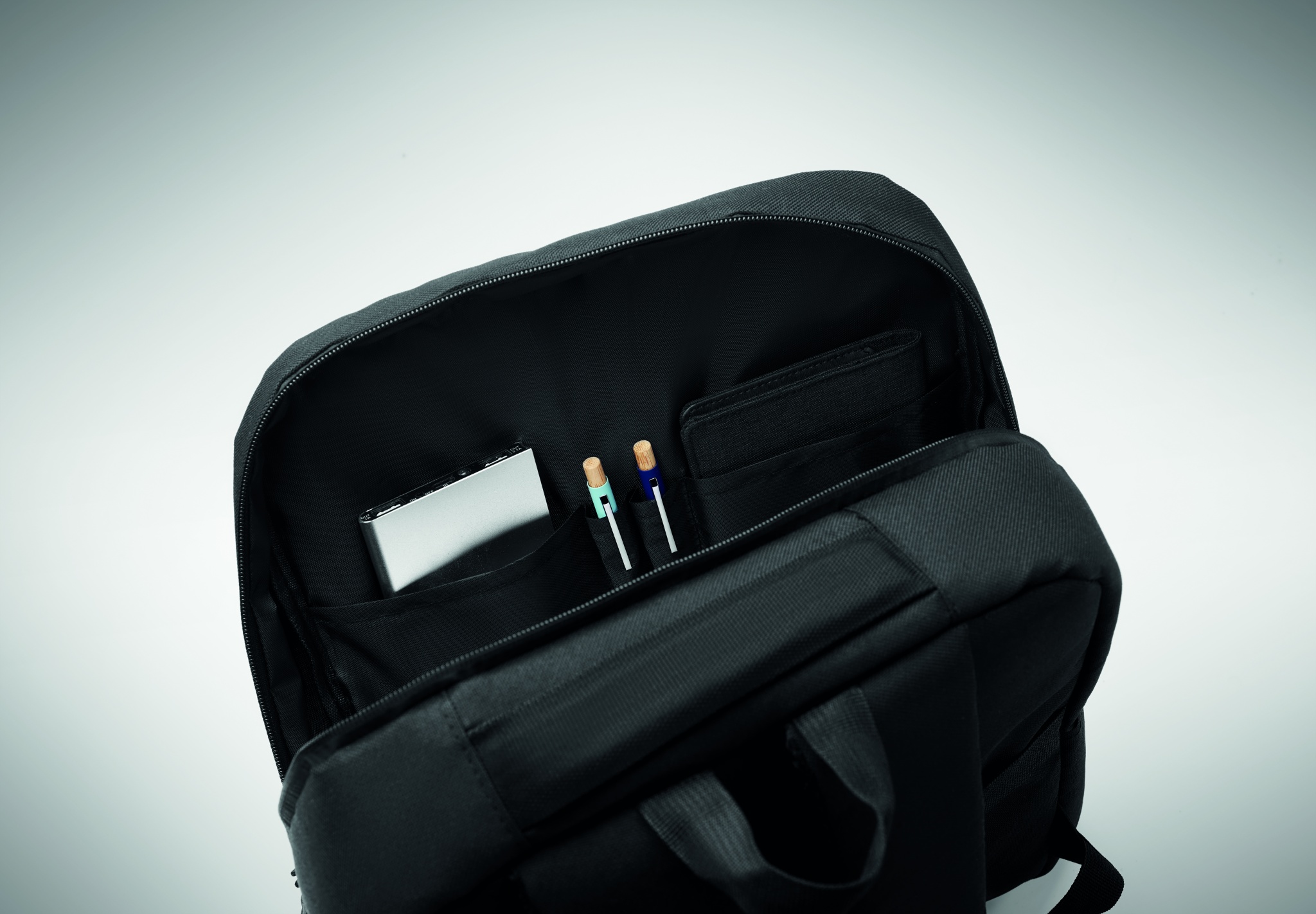 Ohut reppu 600D RPET polyesteriä ja 210D vuori. Siinä on 15"" lokero tietokoneelle. Sisältää taskun 10'' '' tabletille vetoketjulla, 2 sisätaskua, 2 kynätaskua, vetoketjullinen etutasku. 2 sivutaskua. Pehmeät pehmustetut selkä- ja olkahihnat. Trolleypidike.