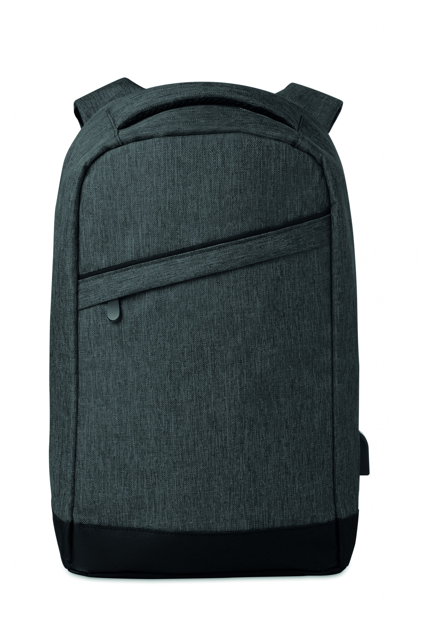 600D- 2 sävyinen polyesterireppu, pehmustetuilla olkahihnoilla. Sisältää yhden 13 tuuman kannettavan tietokoneen taskun ja USB-latauskaapelin. Vetoketjullinen tasku repun selkäosassa.