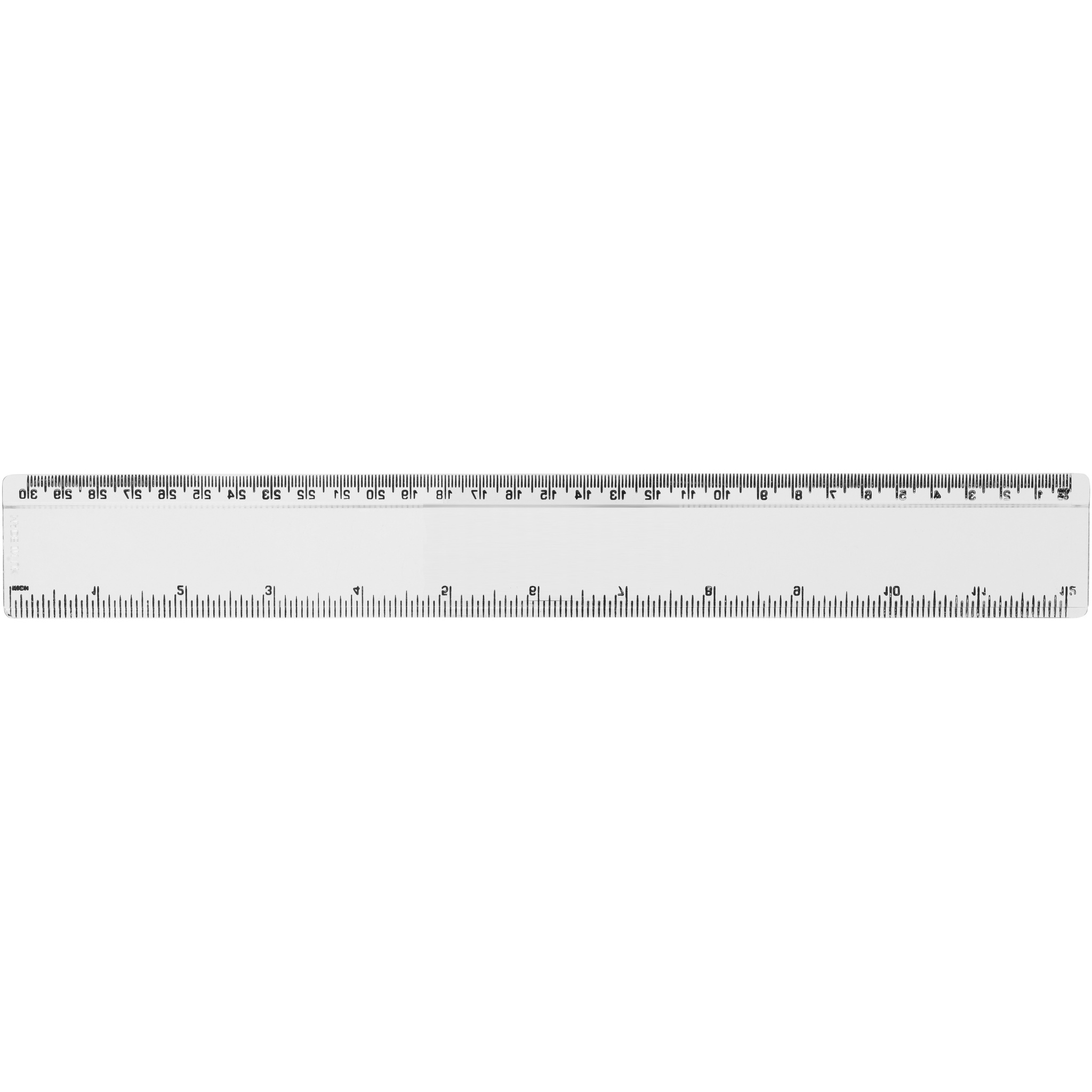 Tukeva muovinen viivain, johon on merkitty tuumat ja senttimetrit. Huomioithan, että myös viivaimen mitat painetaan logopainatuksen yhteydessä. Tuotetta ei voi tilata ilman painatusta.
