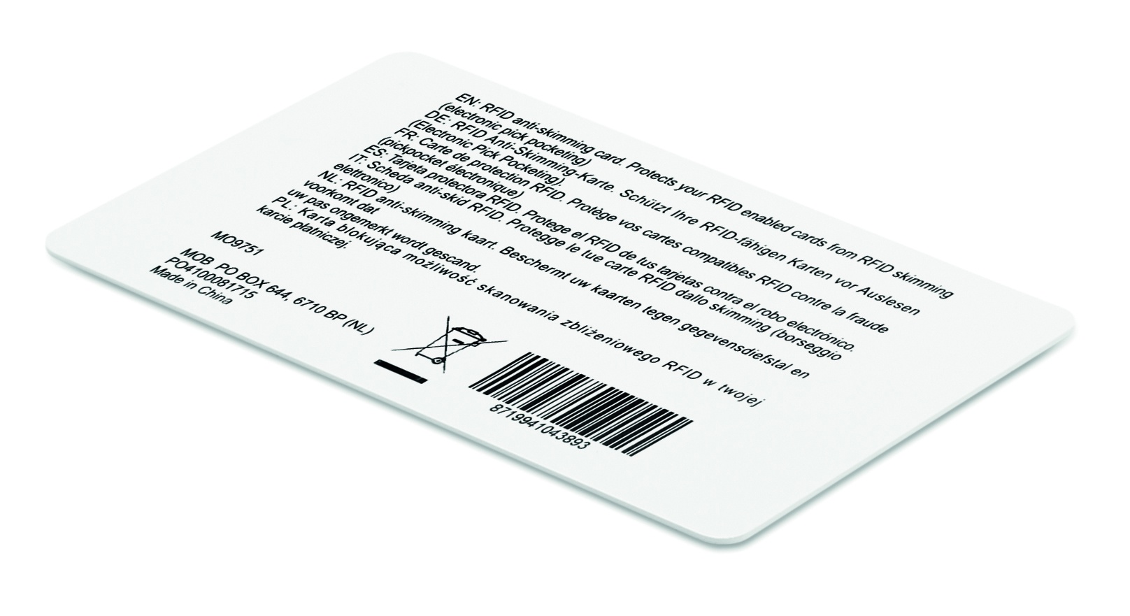 RFID kortti, käyttämällä sähkömagneettista kenttää kortti suojaa kaikki 13,56 MHz kortit (matka-, pankki- /luottokortit) sähköiseltä taskuvarkaudelta 2-3 cm kortin ympärillä. (0,9 mm).