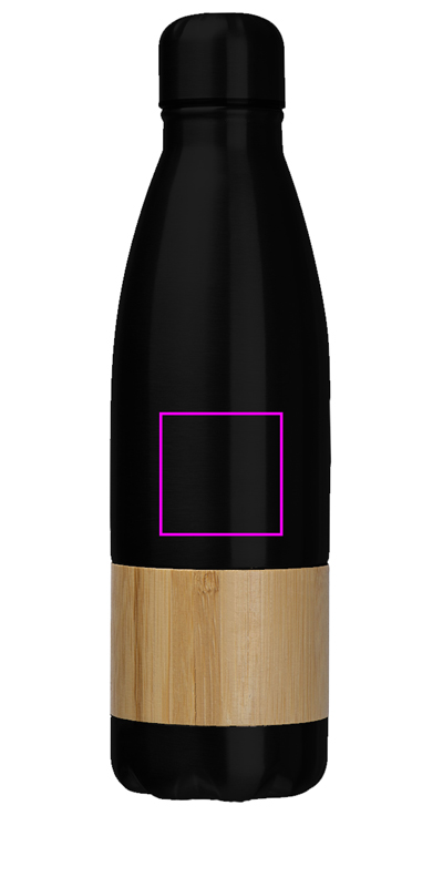 Ruostumattomasta teräksestä valmistettu pullo bamburenkaalla, vuotamattomalla korkilla ja tilavuudella 750 ml. Logosi kaiverretaan pulloon.