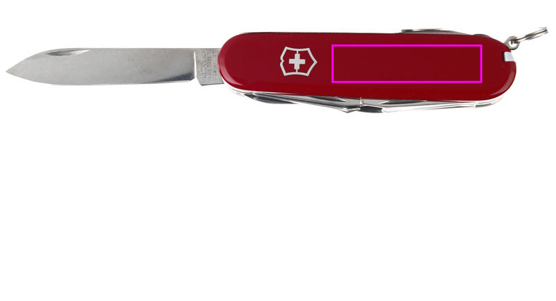 Ominaisuudet: 1.Suuri terä 2.Pieni terä 3.Korkkiruuvi 4.Tölkinavaaja 5.Pieni ruuvimeisseli (3mm) 6.Kannennostin 7.Ruuvinterä (6mm) 8.Langanpoistaja 9.Kalvin 10.Avainrengas 11.Pinsetit 12. Hammastikku