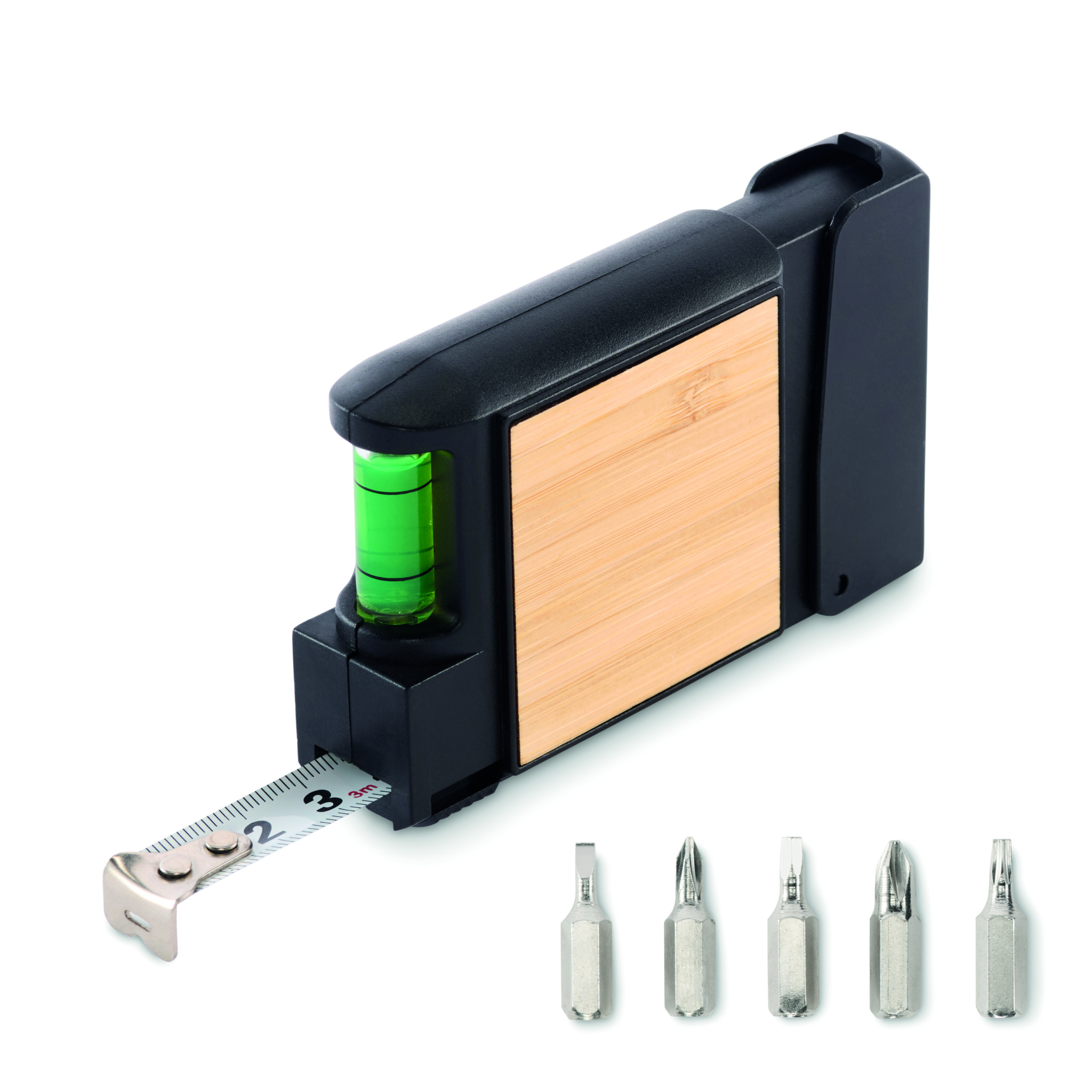3M daugiafunkcinė matavimo juosta su bambuko detalėmis, įskaitant gulsčiuką ir atsuktuvų komplektą su 5 antgaliais.