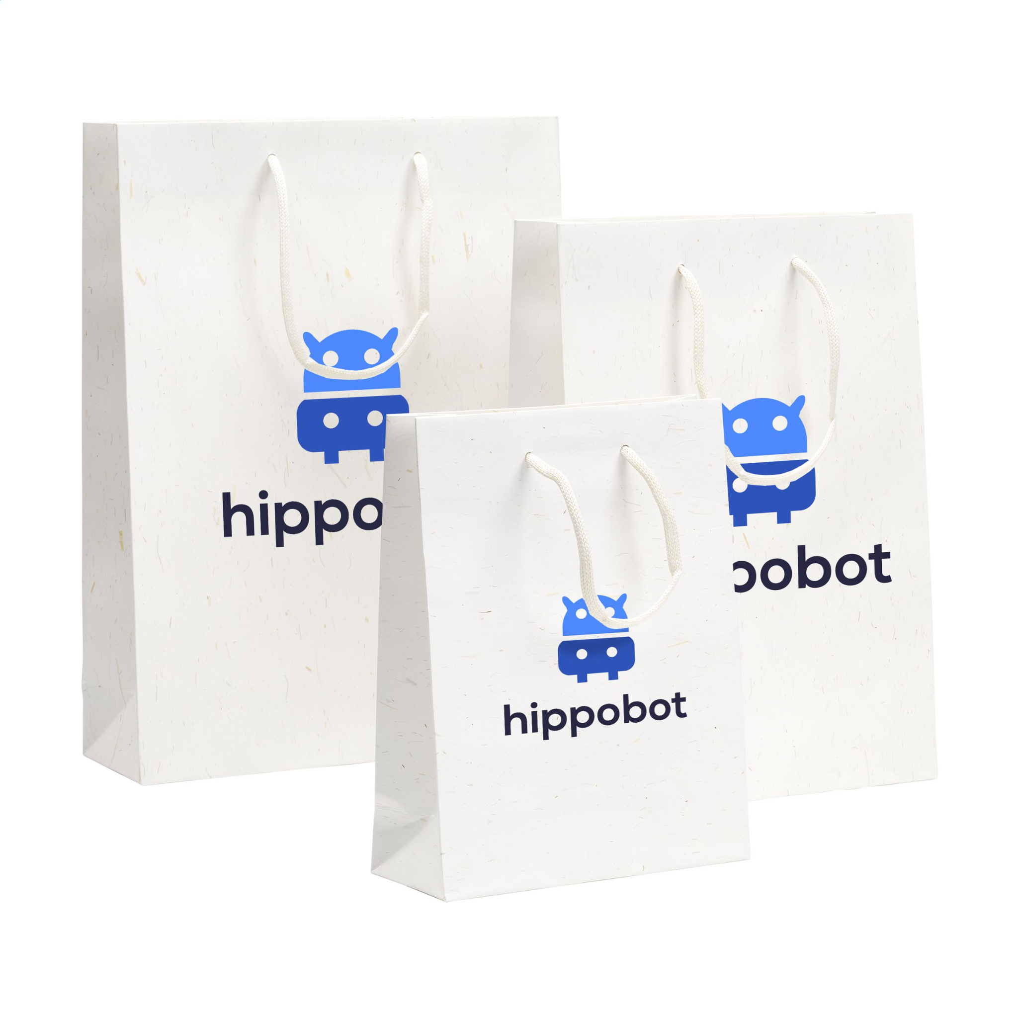Oho! Tvirtas EKO popierinis dovanų maišelis (L dydis), pagamintas iš perdirbto popieriaus su šiaudų pluoštu (180 g/m²). Dėl natūralaus pluošto naudojimo kiekvienas maišelis yra unikalus ir matomi popieriaus nelygumai. Tai suteikia gaminiui gražią natūralią išvaizdą. Kiekviename maišelyje yra dvi trumpos, popierinės austos nešiojimo kilpos, sulankstytas dugnas ir šoninė lenkta. Tinka visiems reklamos tikslams. Šio maišo gamybai jokie medžiai nekertami.