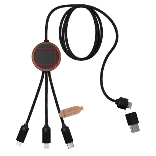 5 viename perdirbtas PET apšviečiantis logotipas įkrovimo kabelis su apvaliu bambuko korpusu. Šviečiantis logotipas matomas abiejose pusėse. Yra 3 jungtys (C tipas, mikro USB, iPhone) ir dviguba USB jungtis universaliam naudojimui. Pristatomas TPU maišelyje su kraftpopieriaus kortele. Kabelio ilgis: 1 metras. Įeina 3 metų garantija.
