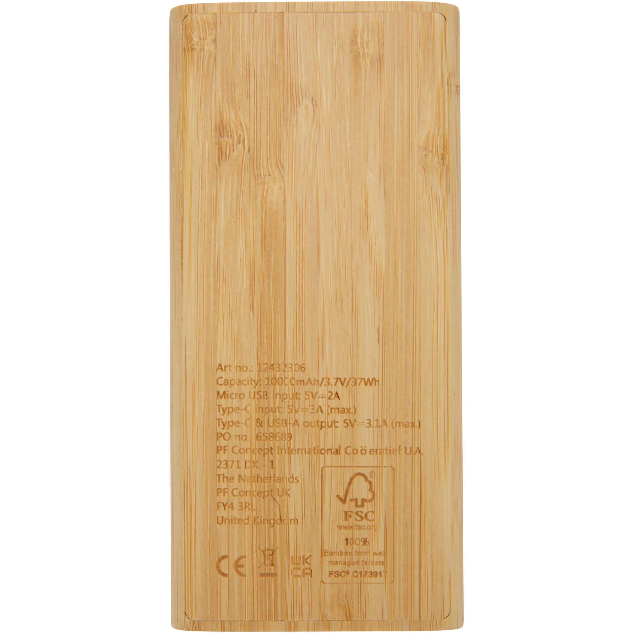 10 000 mAh maitinimo blokas pagamintas iš bambuko, su ON/OFF jutikliniu mygtuku ir 4 LED indikatoriais, rodančiais likusią akumuliatoriaus talpą. Mikro USB įvestis 5V/2A, C tipo įvestis 5V/3A, C tipo išvestis 5V/3,1A max, dviguba USB-A išvestis 5V/3,1A max, bendra galia 15,5W. Pristatomas su 30 cm TPE 3A Type-C į Type-C įkrovimo laidu, naudojimo instrukcija ir kraftpopierine dovanų dėžute. Kadangi bambukas yra natūralus produktas, kiekvienos prekės spalva ir dydis gali šiek tiek skirtis, o tai gali turėti įtakos galutiniam spausdinimo rezultatui.