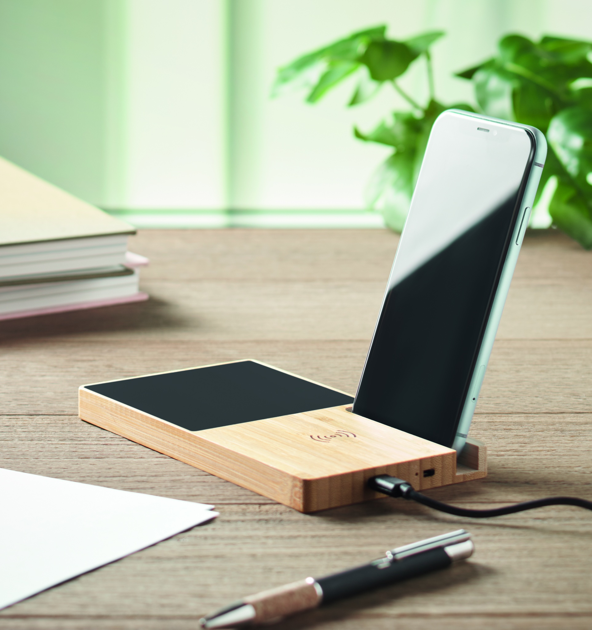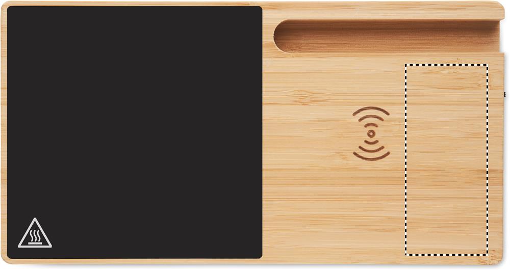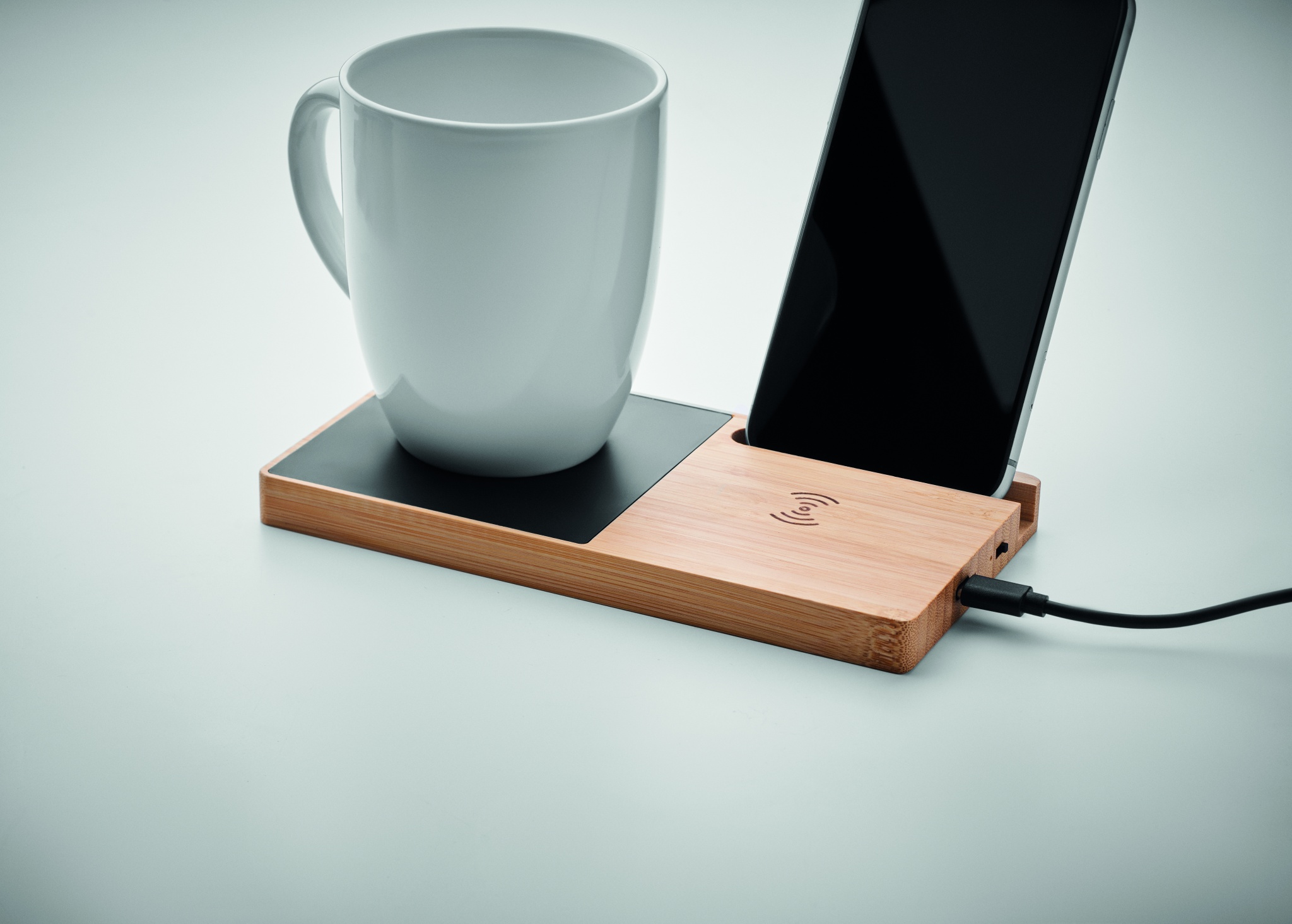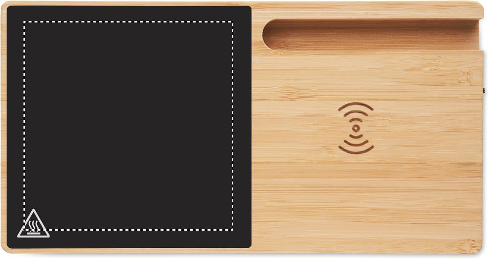 Bezvadu lādētājs no bambusa, ieskaitot krūzes sildītāju un tālruņa statīvu. Savienojiet ierīci ar datoru, novietojiet viedtālruni uz tā un ļaujiet tai uzlādēties. Izeja: DC 9V/1.67A (15W). Savietojams ar visām QI iespējotām ierīcēm, piemēram, jaunākajām Android ierīcēm, iPhone® 8, X un jaunākām ierīcēm.