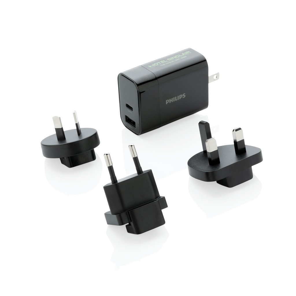 Philips īpaši ātrs 30 W PD ceļojumu lādētājs. Ar ērtu ceļojumu maciņu. Nāk ar 4 spraudņiem; integrēts ASV spraudnis un maināmi AU, UK un ES spraudņi. Ieeja: 100–240 V, 50–60 Hz 0,7 A Izeja USB A 5 V/2,4 A tips C 5 V/3 A, 9 V/2 A, 12 V/1,5 A. Iepakots Philips dāvanu kastītē.