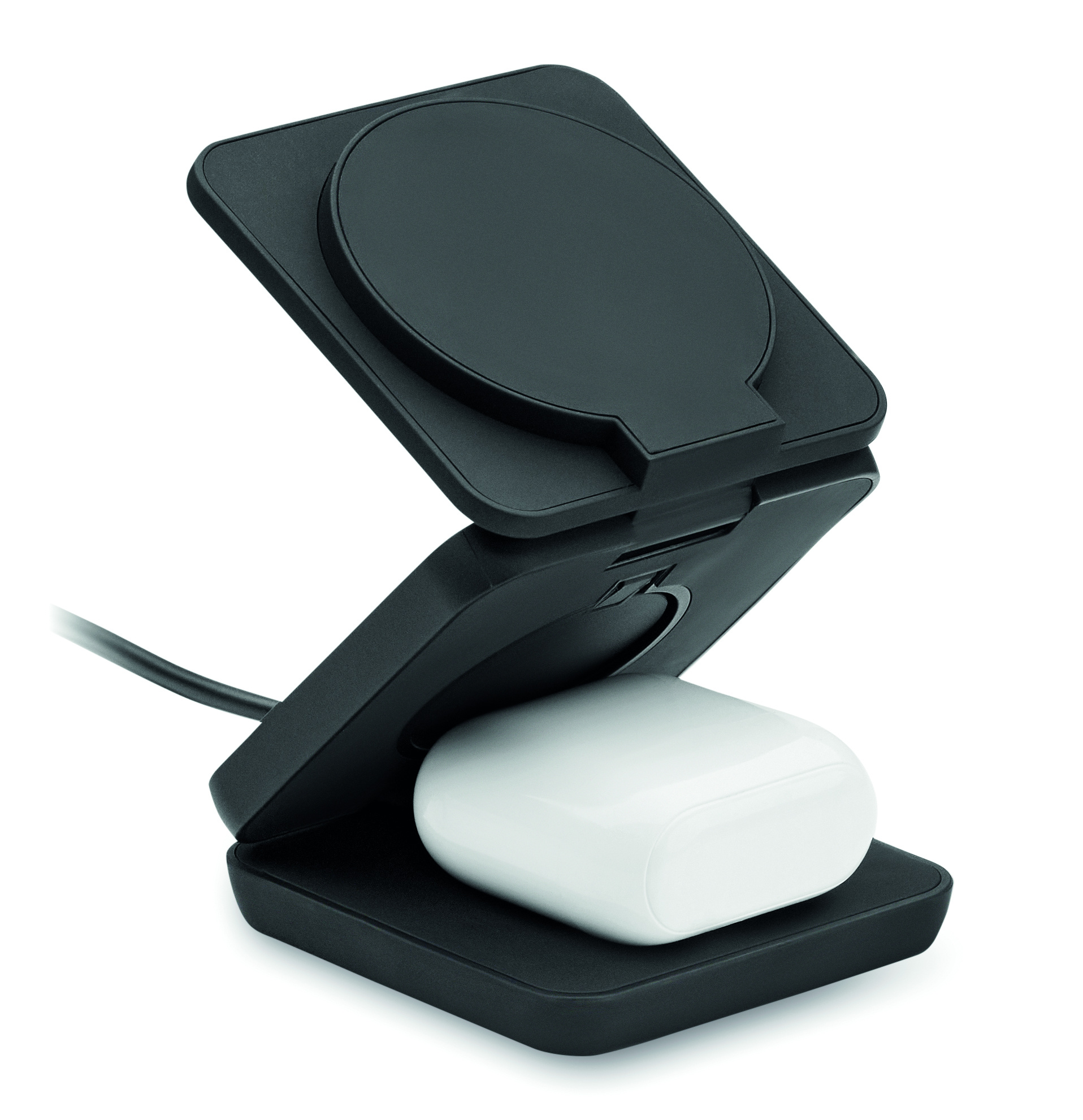 3 in 1 foldable charging station in rubberized recycled ABS. It includes a magnetic wireless charger 15W, smartwatch charger (Apple®only) and TWS charger.