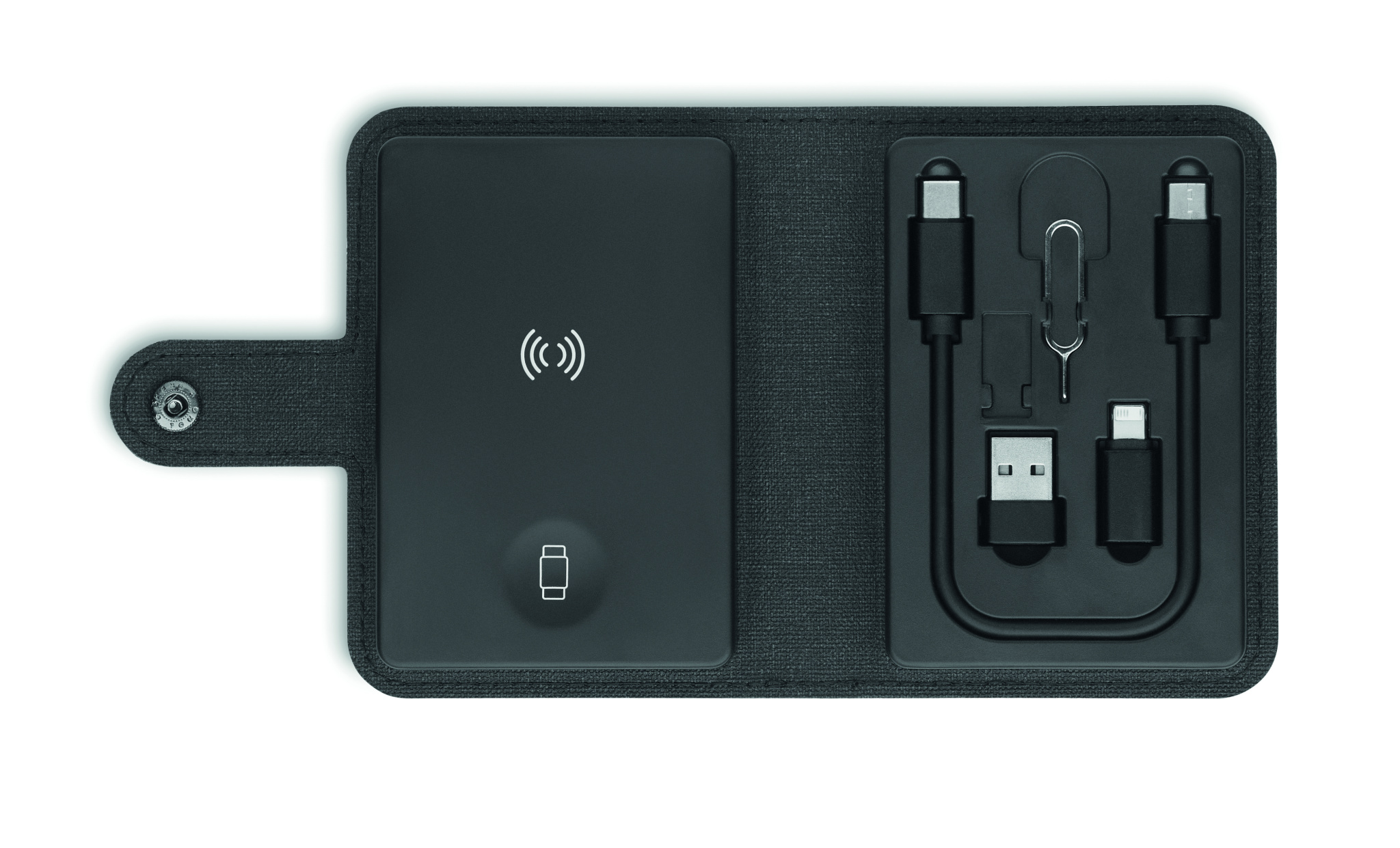 Cable connector set with wireless charger 15W and watch charger (Apple®only). 4 in 1 charging cable with ejector pin tool. Recycled PU cover, plastics in recycled ABS and recycled aluminium plate.