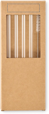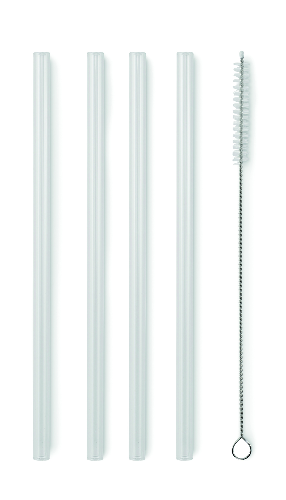 Pack of 4 reusable straws in high borosilicate glass with 1 cleaning brush.