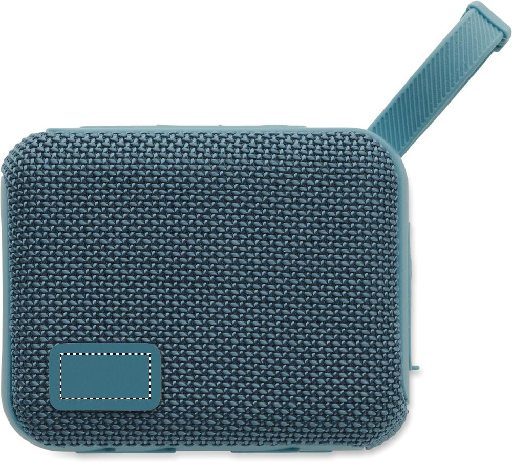 5.0 wireless speaker in ABS with RPET fabric and hanging cord. 1 Rechargeable Li-ION 800 mAh battery included. Includes an SD card port and an AUX/ USB cable. Output data: 5W, 3 Ohm and 5V. Playing time approx. 3h