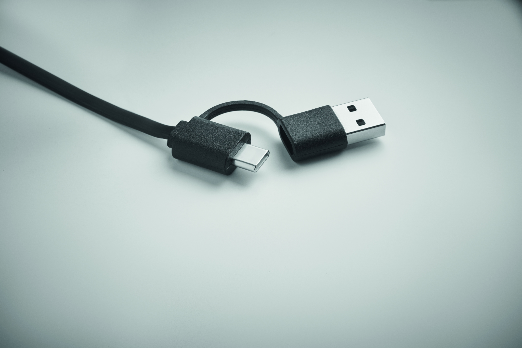 60W retractable cable in recycled ABS casing. Input: 2-in-1 Type-C and Type-A. Output: Type-C and micro-B (2 in 1 pin). Cable length: 80 cm.
