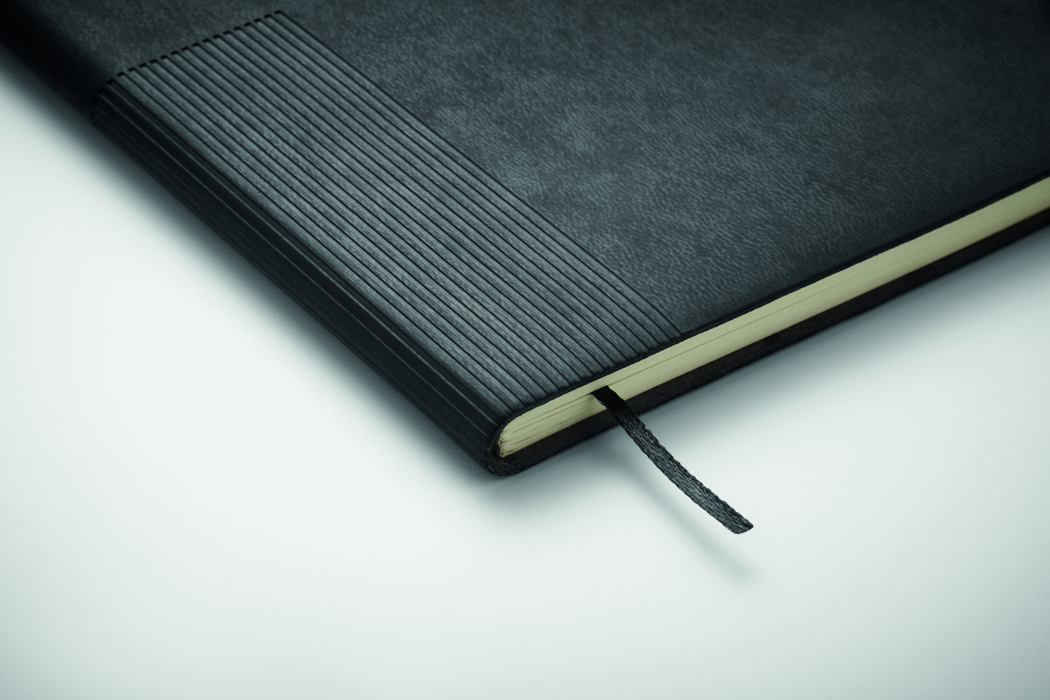 A5 PU notebook with soft cover. Casebound. 160 lined recycled paper pages (80 sheets). Matching elastic band and ribbon bookmark. Metal detail on the front.