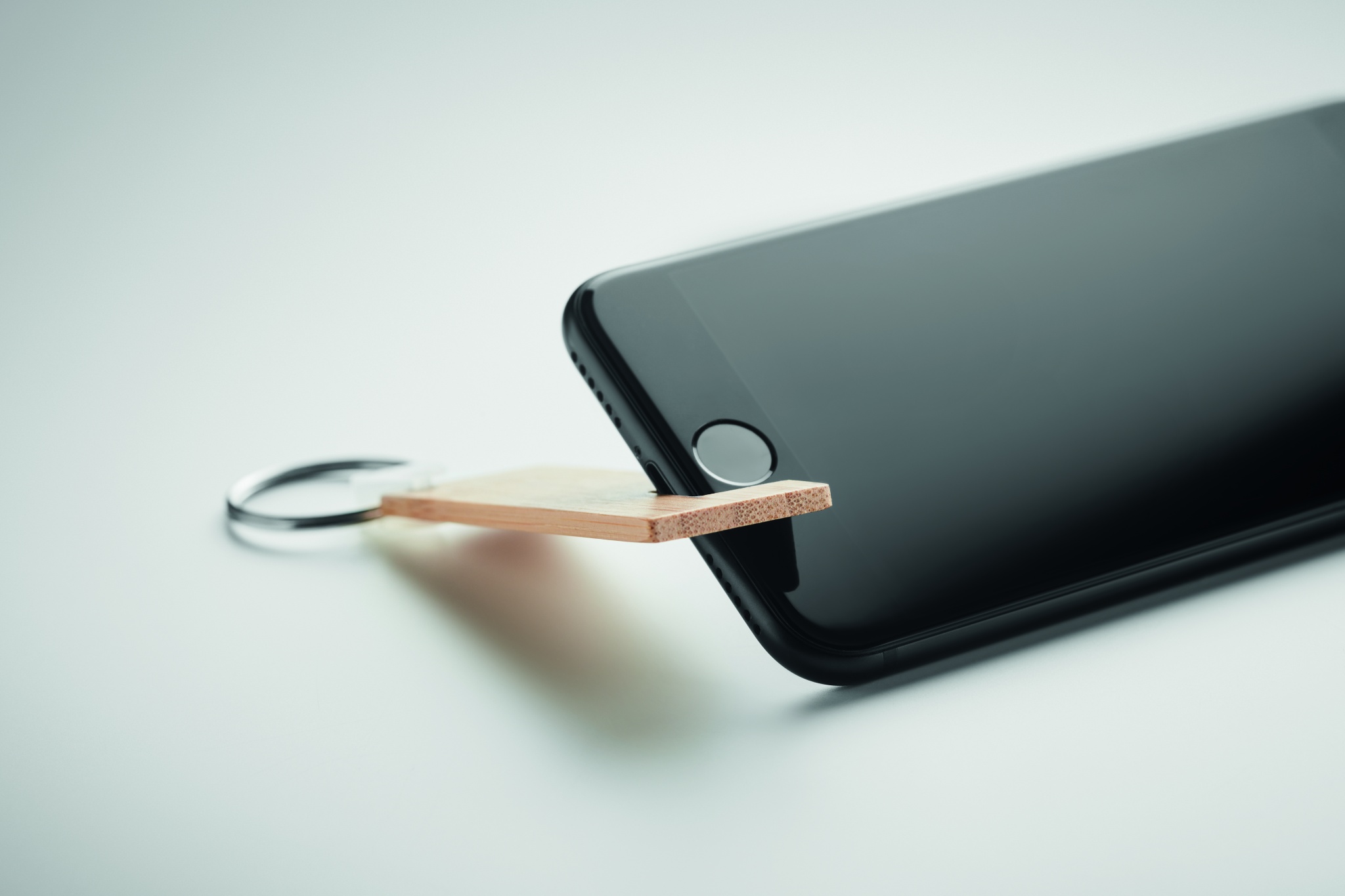 Бамбуковый брелок для ключей с функцией подставки для телефона.