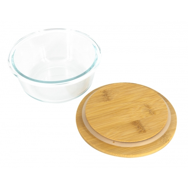 Универсальная миска из боросиликатного стекла с надежно закрывающейся бамбуковой крышкой и объемом 300 мл. На крышке будет выгравирован ваш логотип.