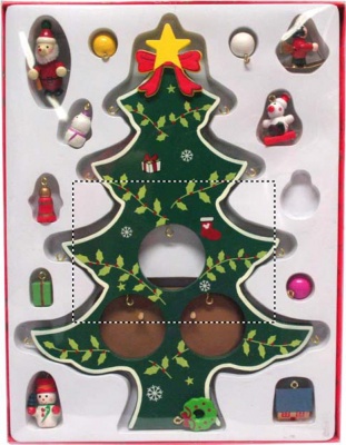 Деревянная новогодняя ёлка с 12 различными ёлочными украшениями. Индивидуальная упаковка с прозрачной крышкой.