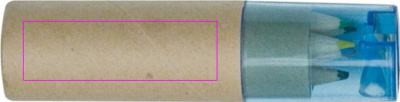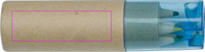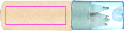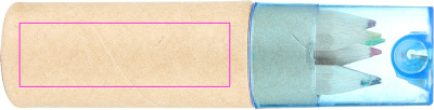 Картонная коробка с шестью короткими, толстыми цветными карандашами и встроенной точилкой с синей прозрачной пластиковой крышкой. Мы нанесем ваш логотип на коробку методом тампопечати.