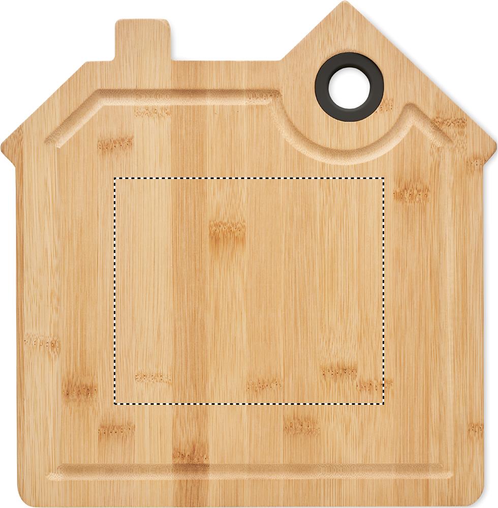 Разделочная доска в форме домика из бамбука с желобком и отверстием для подвешивания.