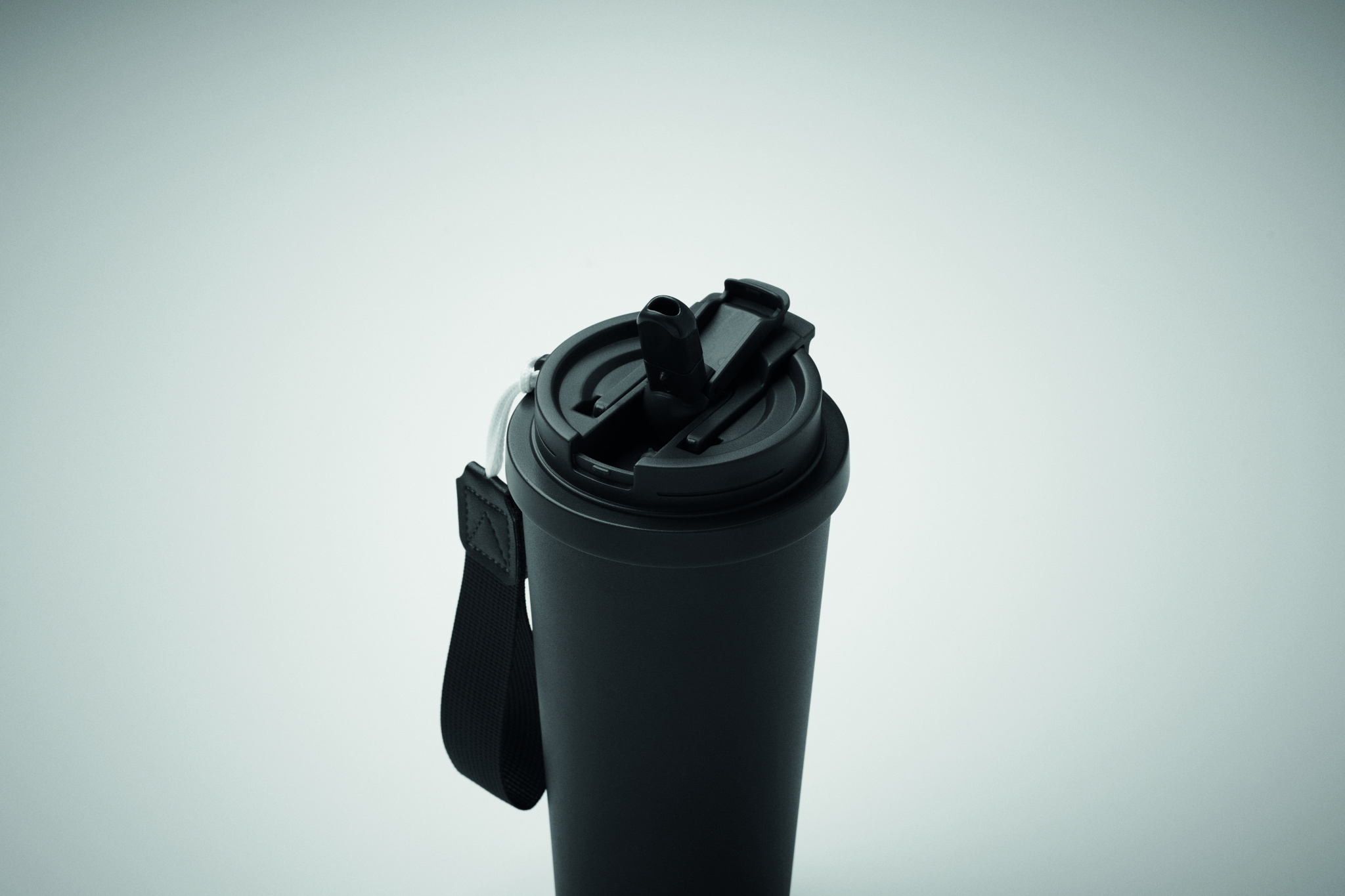 Double wall 90% recycled stainless steel (90% recycled stainless and 10% stainless steel) tumbler with PP lid (2-in-1 drinking sip and straw lid) and with RPET carry strap. Leak-free. Capacity: 500 ml.