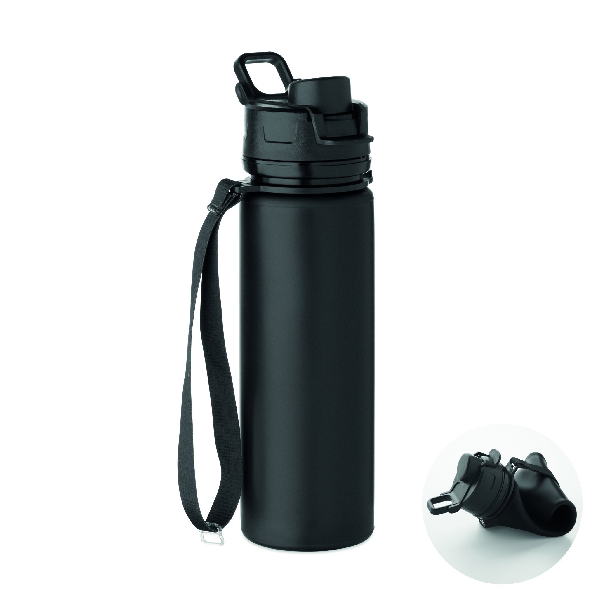 Foldable silicone sports bottle with PP lid, handle, polyester strap, and transparent buckle to secure when folded. Leak-free. Capacity: 500 ml.