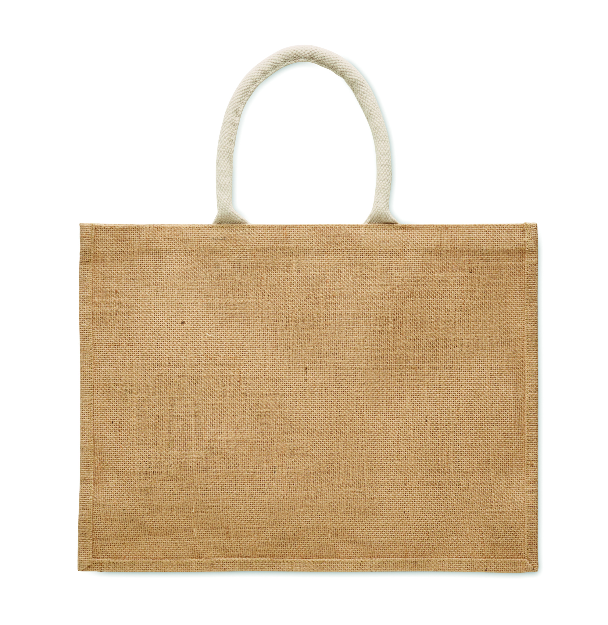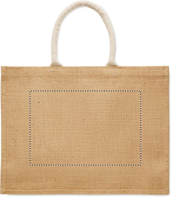 Shopping bag made of laminated jute and 280 gr/m² cotton canvas with cord handles. Includes large open front pocket.