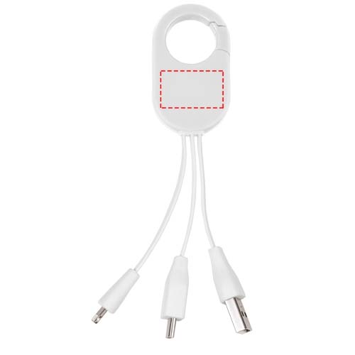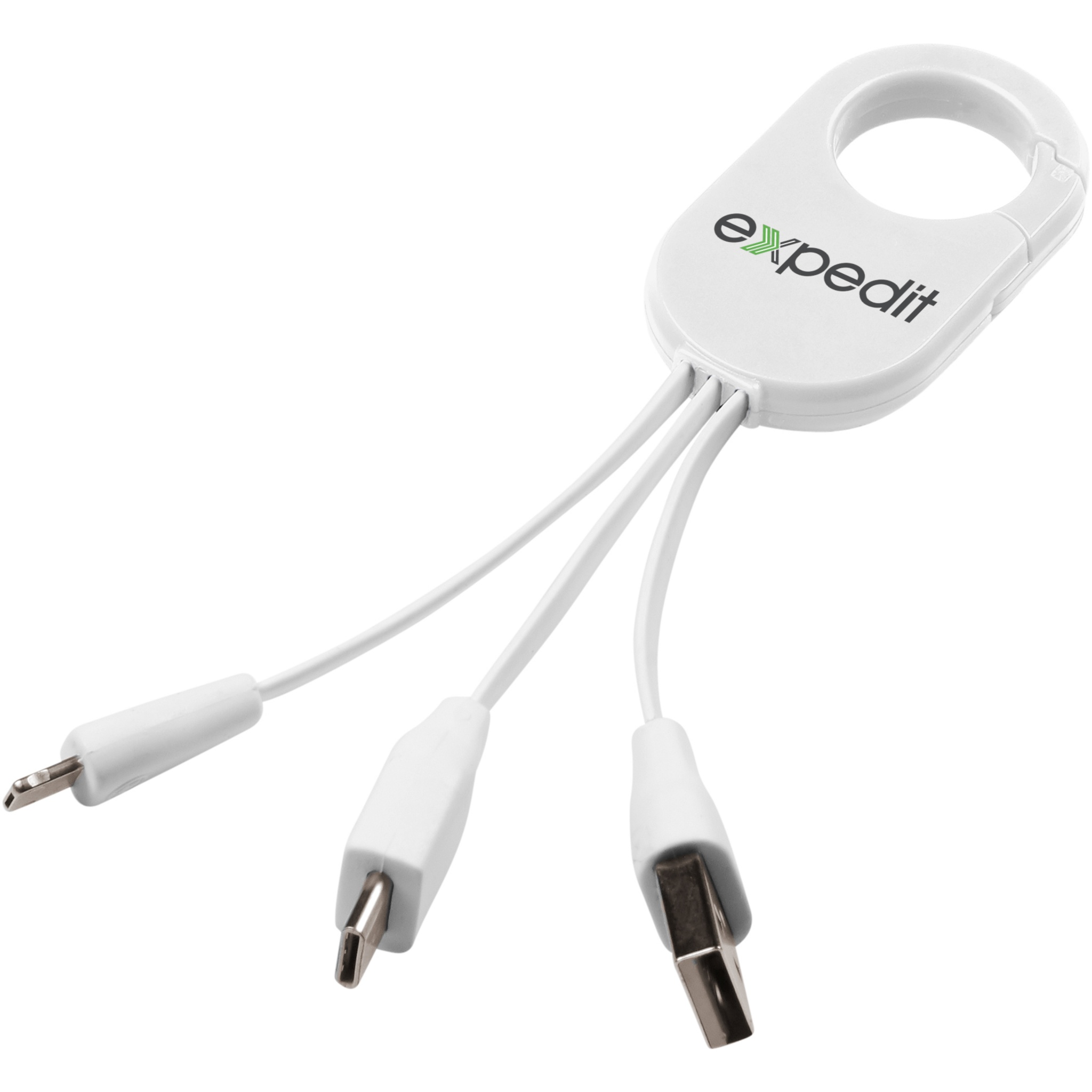 Кабель для зарядки Troop «3-в-1» с коннектором USB Type C и двойным совместимым коннектором «2-в-1» для устройств Apple® iOS и Android. Кабель оснащен карабином для удобного крепления к сумке.