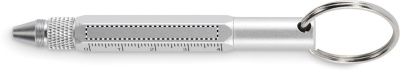 Key ring with twist action pen in recycled aluminium with 4cm/ 1,5 inch ruler, stylus and 2 in 1 phillips and flat head screw driver. Black ink.