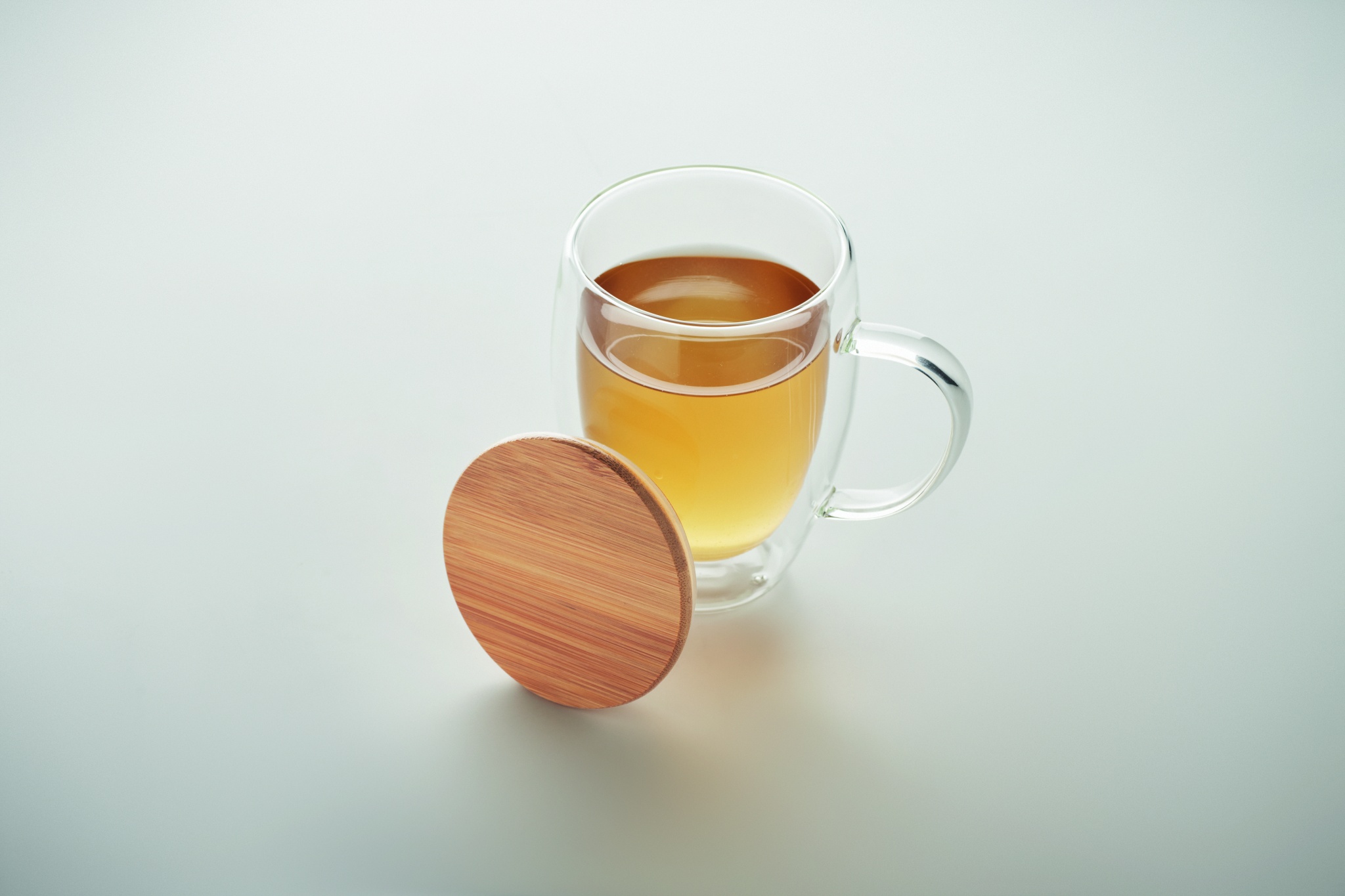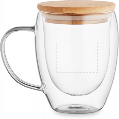 Кружка из боросиликатного стекла с двойными стенками, ручкой и бамбуковой крышкой. Объем: 300 мл.