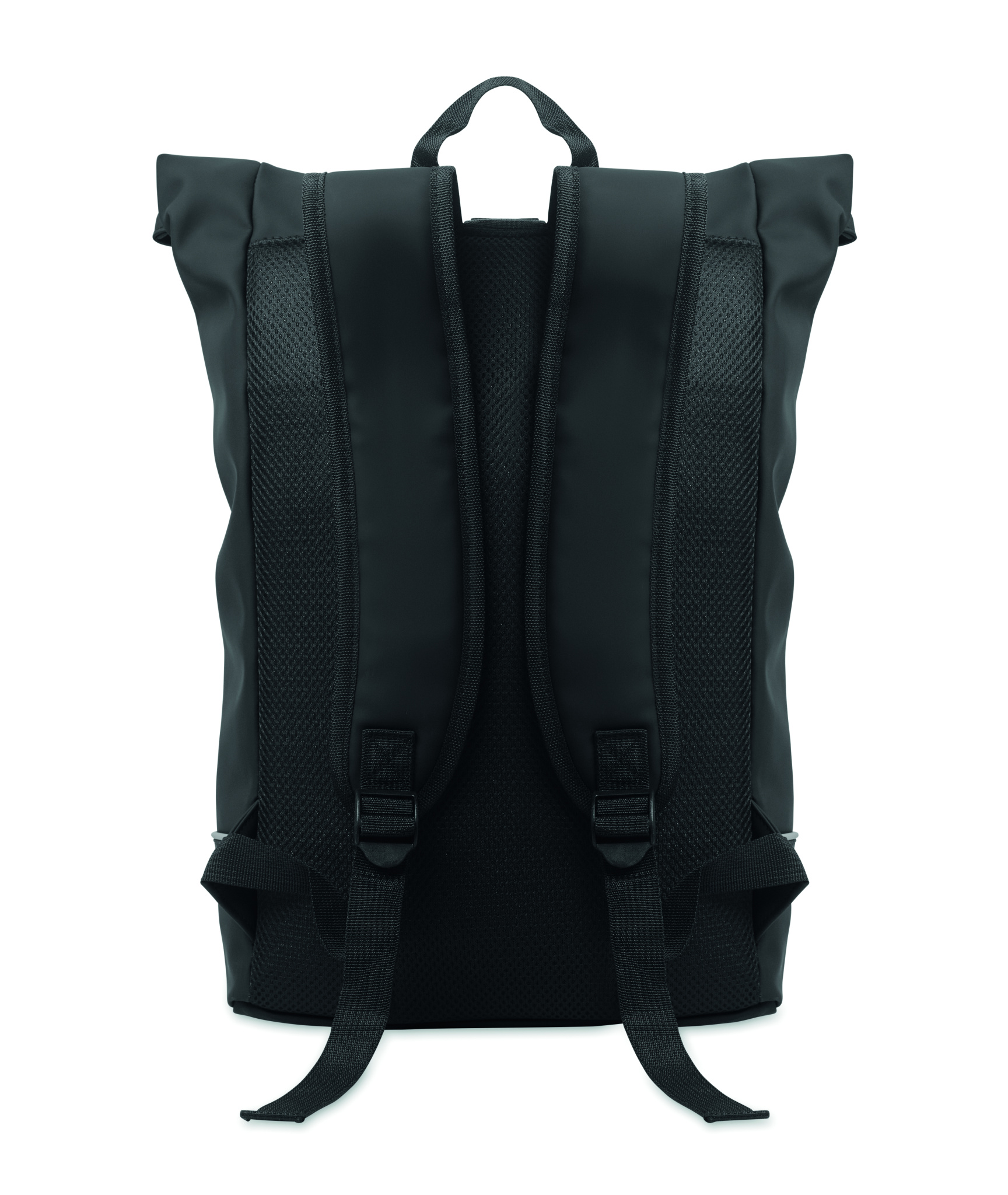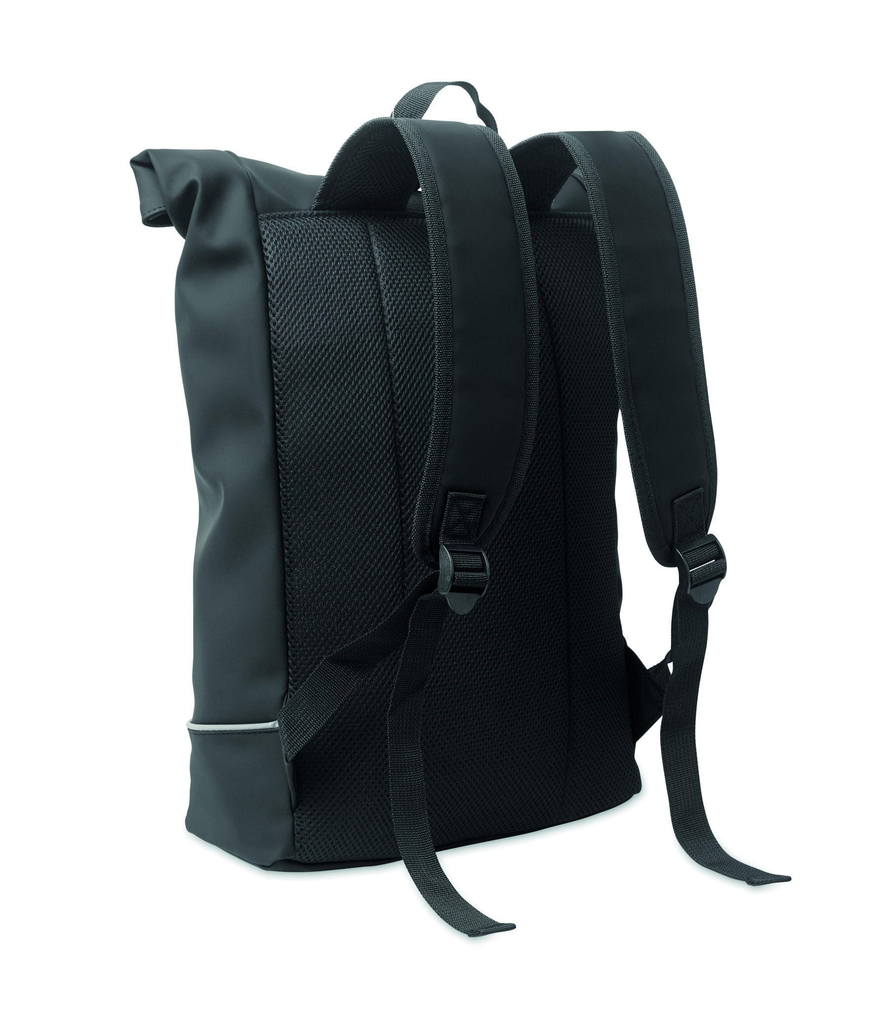 15 inch roll top laptop backpack in soft PU with padded back and base reinforcement with reflective strip. Waterproof zippered front pocket. 210D RPET polyester lining.