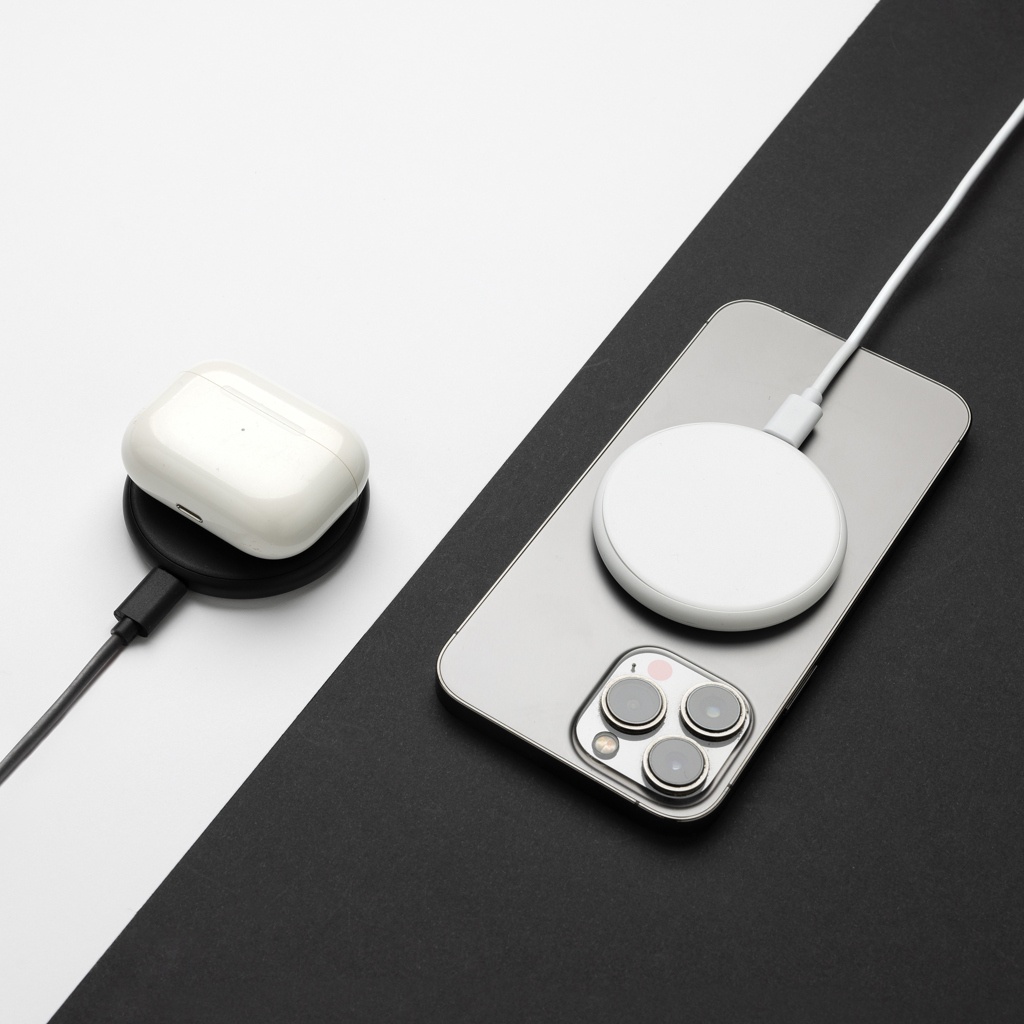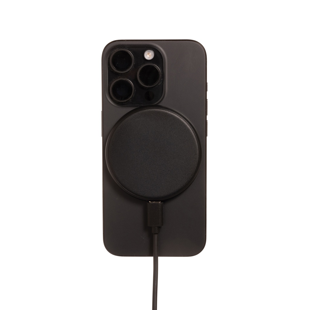 Уникальный дизайн магнитного беспроводного зарядного устройства мощностью 15 Вт, которое дает вам возможность заряжать либо ваше мобильное устройство, либо наушники, либо iWatch. Просто нажмите на них и начните зарядку. Изготовлено из переработанного АБС и переработанного ТПЭ. Общее содержание переработанных материалов: 35% от общего веса изделия. Сертификация RCS гарантирует полностью сертифицированную цепочку поставок переработанных материалов. Включая 120-сантиметровый кабель для зарядки USB A - USB C из сертифицированного RCS переработанного ТПЭ. Упаковано в упаковку FSC®. Не содержит ПВХ. Выход 9 В.2.2 А Выход часов: 9 В/0,4 А, Выход наушников: 9 В/0,5 А. Вход 9 В/3 А.