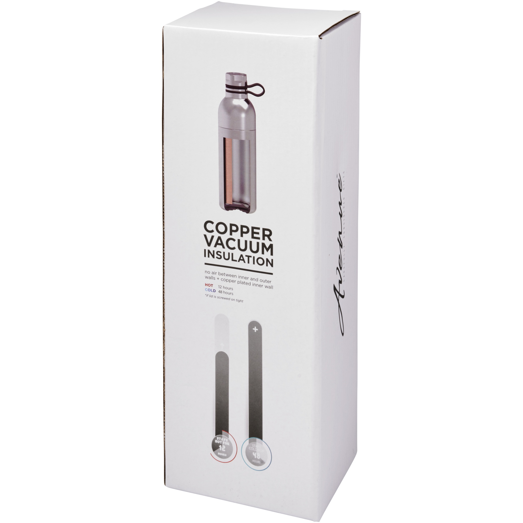 Двустенная вакуумная конструкция из нержавеющей стали с медной изоляцией позволит вашему напитку оставаться холодным в течение 48 часов и горячим — как минимум 12 часов. Кроме того, конструкция препятствует образованию конденсата на внешней стороне бутылки. Оснащена закручивающимся колпачком и крышкой из нержавеющей стали с удобной силиконовой петлей-держателем. Конструкция с двойным отверстием для легкой очистки и заполнения. Объем — 590 мл. Упакована в подарочной коробке Avenue.