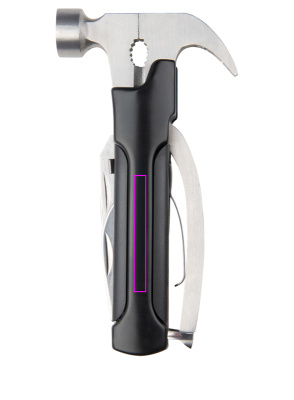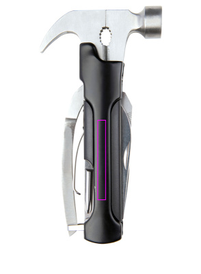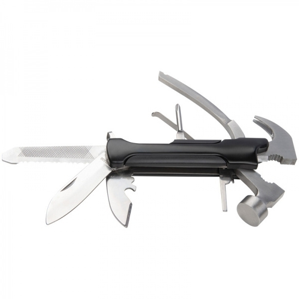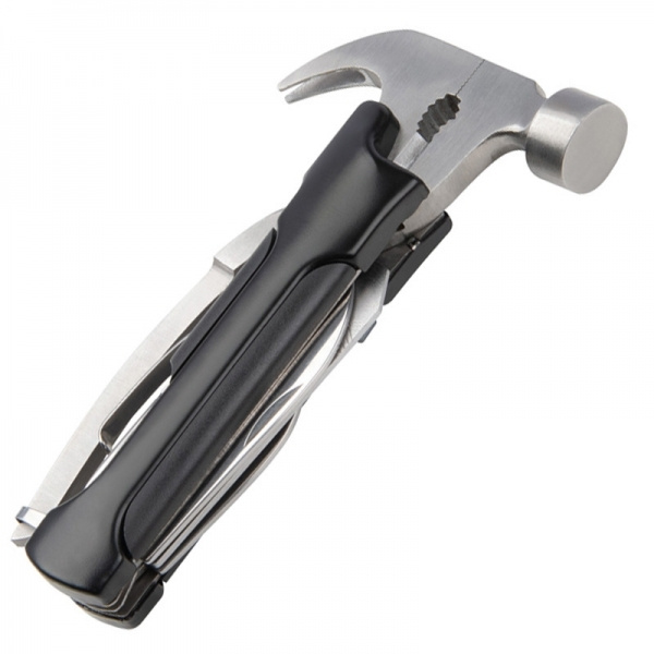 Многофункциональный инструмент (нержавеющая сталь), состоящий из молотка, напильника, двух лезвий, пилы, шлицевой отвертки и открывашки для бутылок. В комплект входит соответствующий футляр, на котором мы напечатаем ваш логотип в центре.