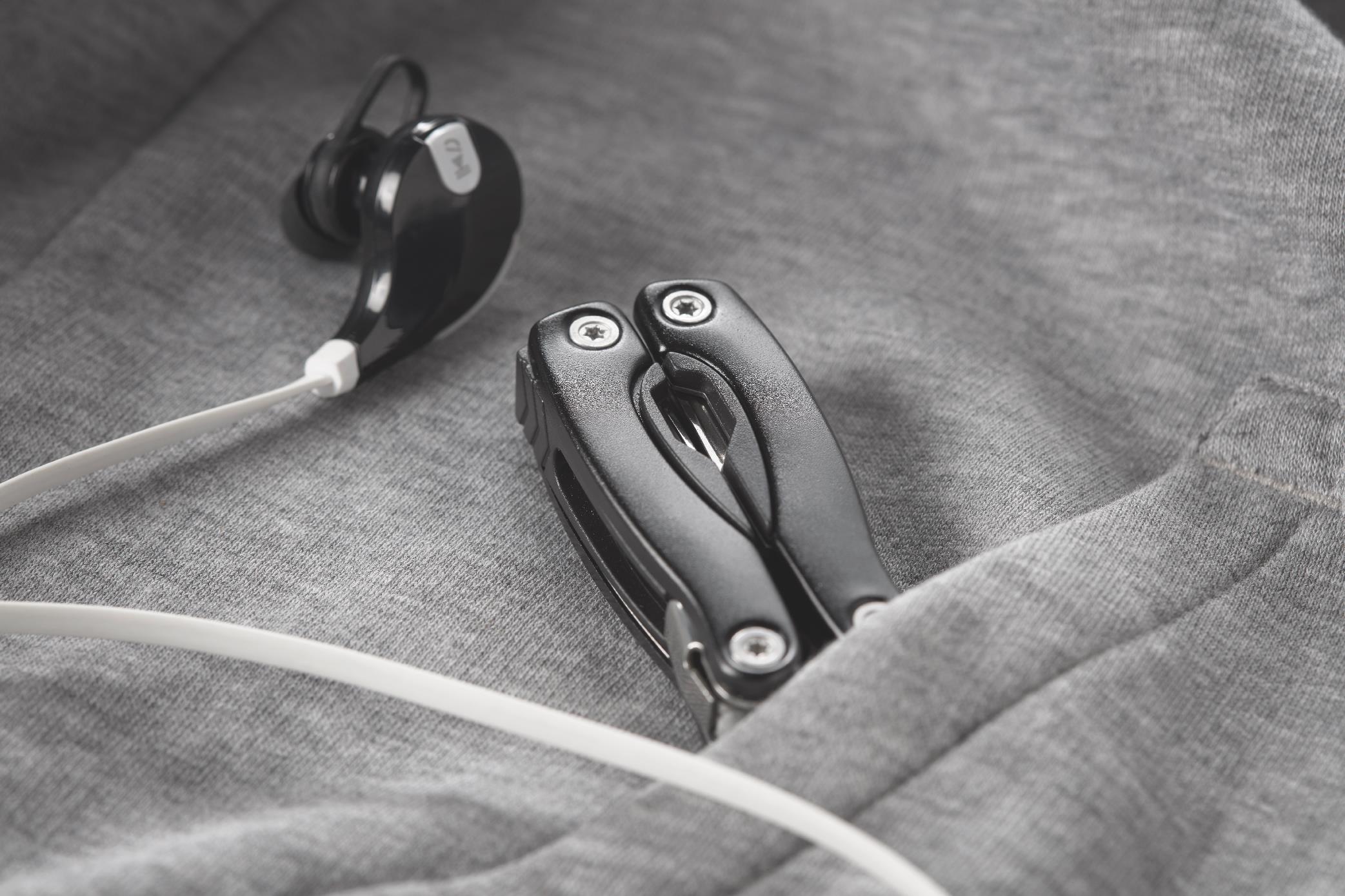 Металлический складной набор инструментов из 9 предметов в мешочке из полиэстера.