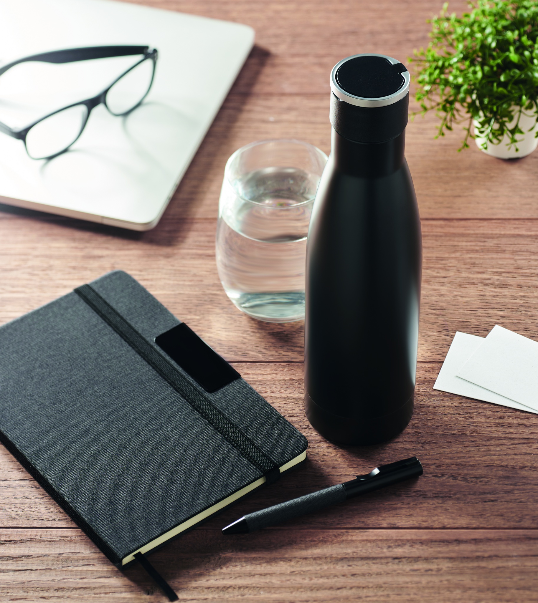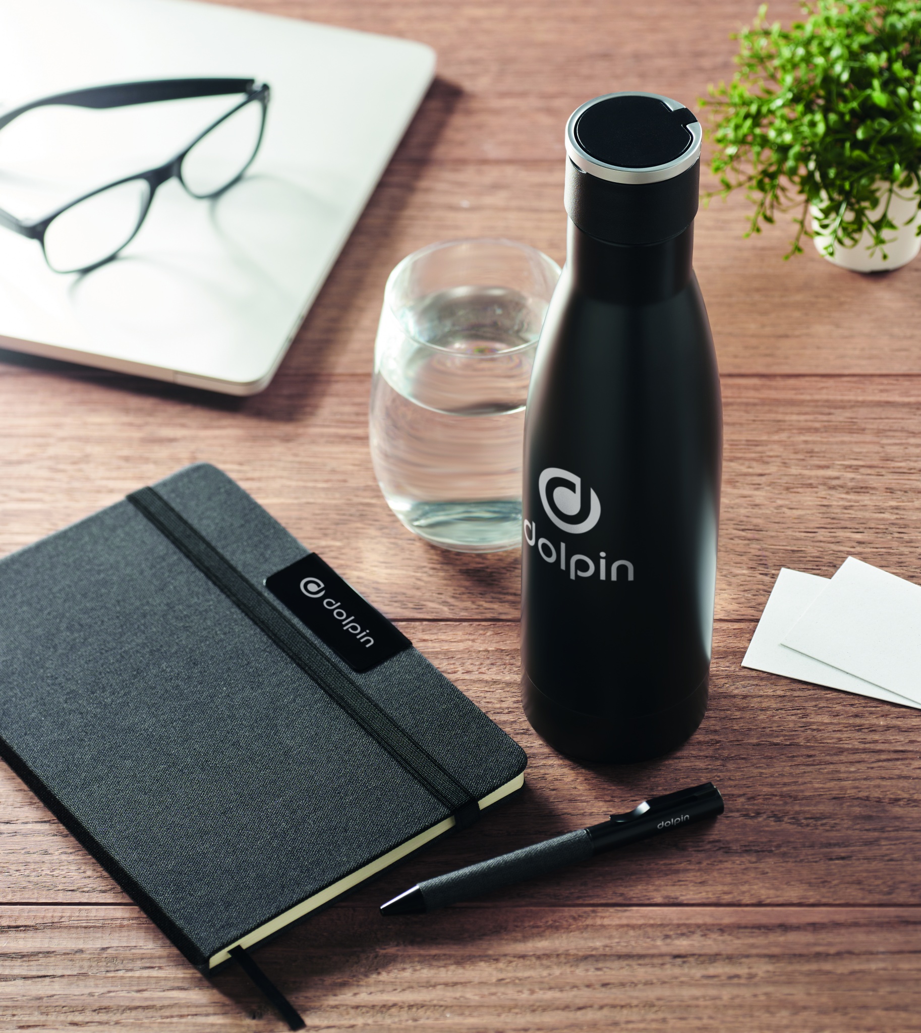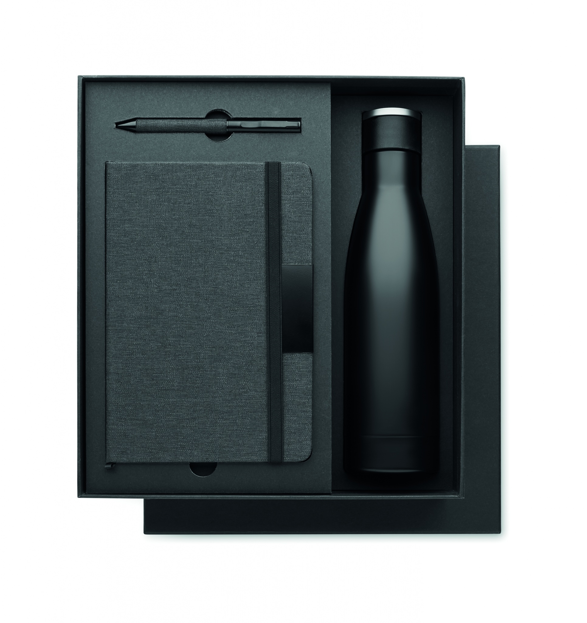 Роскошный подарочный набор из трех предметов: блокнот формата А5 в твердой обложке из RPET. В переплете. 160 линованных страниц из переработанной бумаги (80 листов). Шариковая ручка. Бутылка с двойными стенками из нержавеющей стали с вакуумной изоляцией. Объем: 500 мл. Поставляется в подарочной коробке.