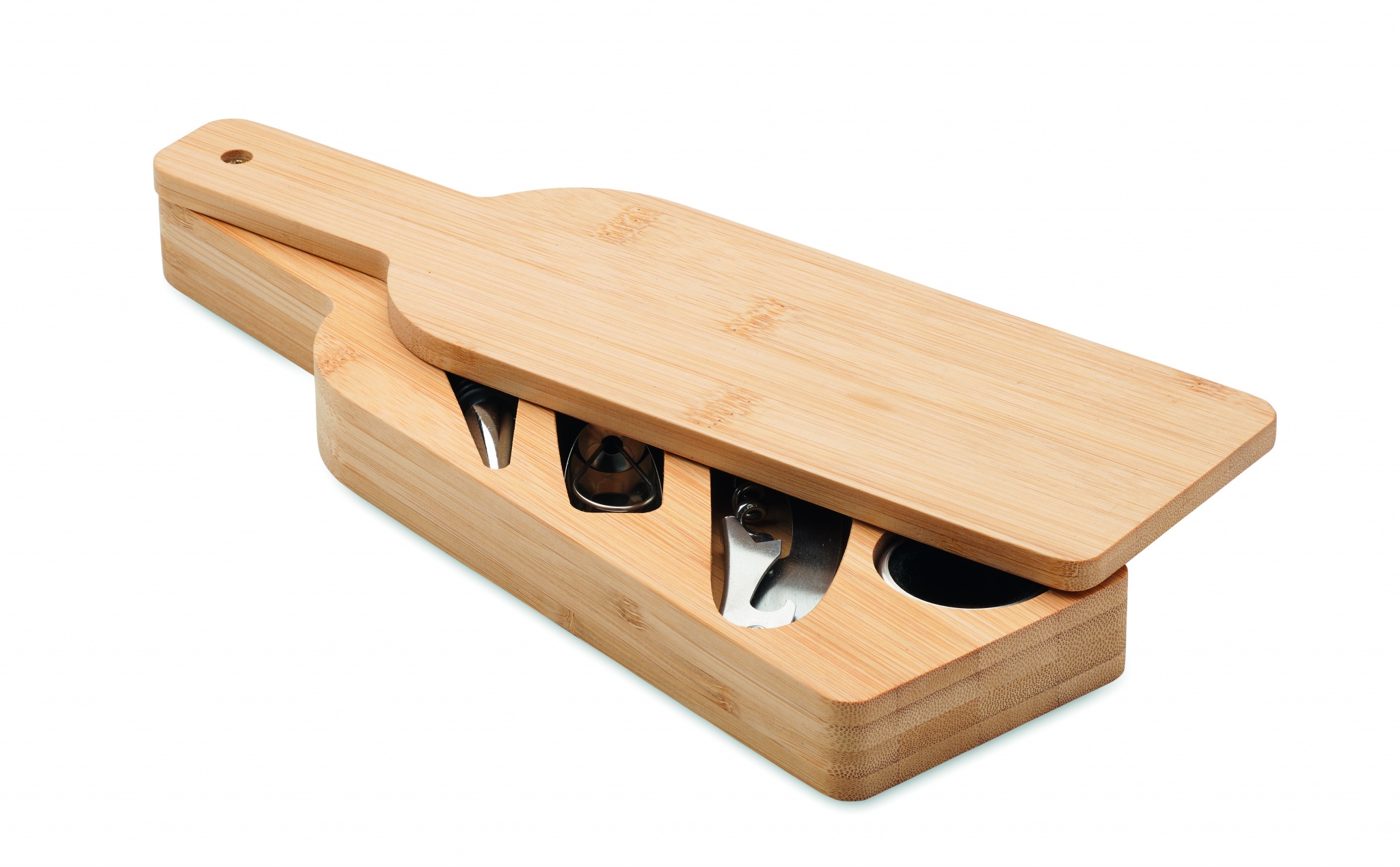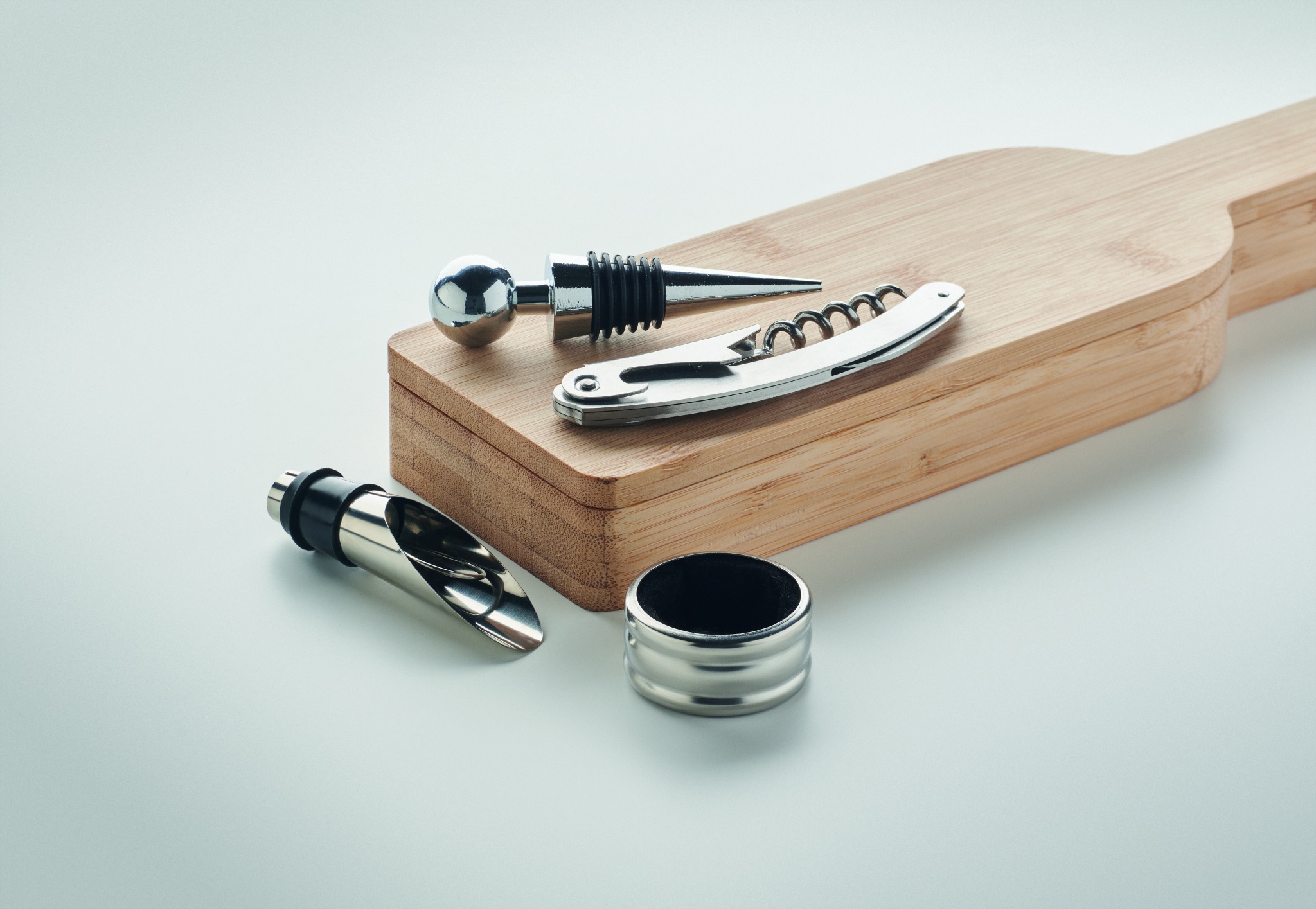 Набор для вина в форме бутылки в бамбуковом футляре. В набор входят штопор, аэратор для вина, пробка и кольцо для бутылки.