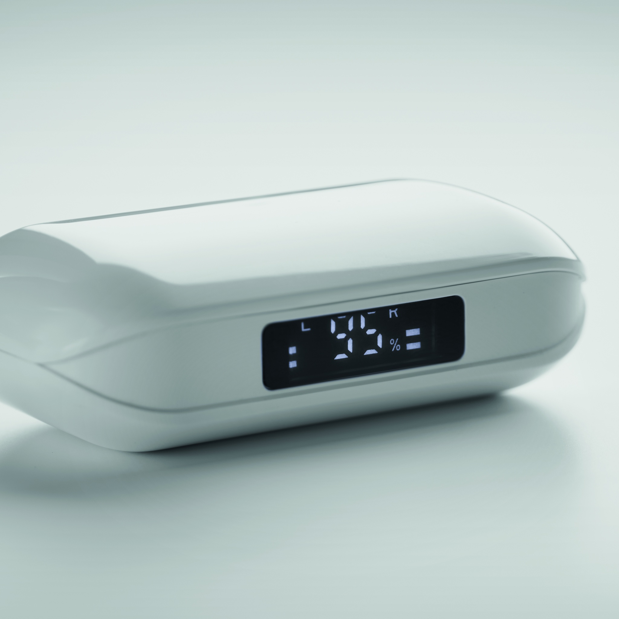Беспроводные стерео наушники 5.0 из переработанного пластика с микрофоном и аккумулятором 25 мАч. Время воспроизведения около 3 часов. Имеет дисплей уровня заряда. Автоматическое сопряжение. В комплекте кабель для зарядки Type C и зарядная станция 250 мАч.
