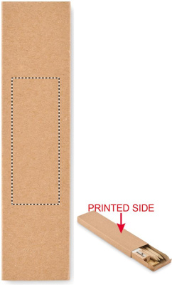 Paper box with 3 sharpened pencils, 1 wooden sharpener, 1 eraser and 1 wooden ruler.