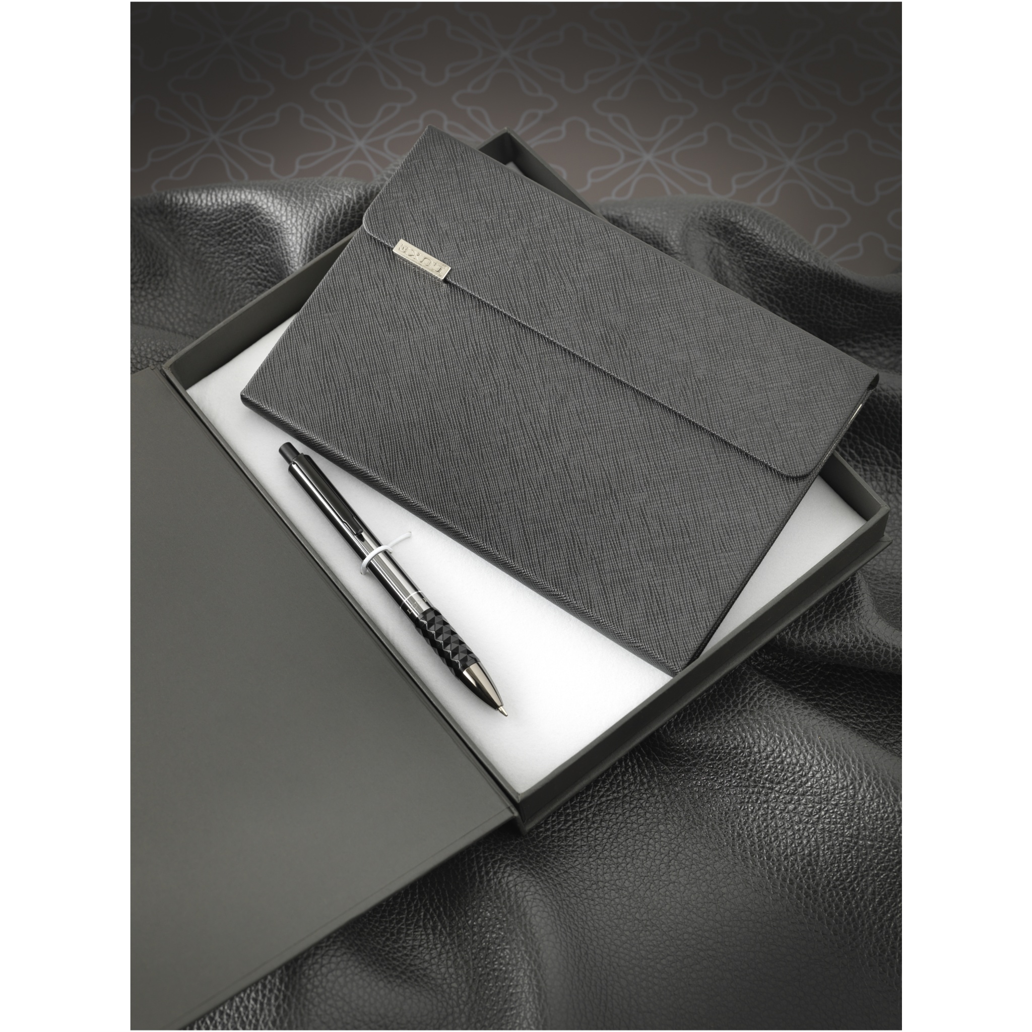 Эксклюзивный блокнот формата A5 с обложкой из термополиуретана, черной лентой-закладкой, застежкой на магните и 80 линованными листами (80 г/м²) кремового цвета. Предлагается с шариковой ручкой Tactical с кнопкой. Оба изделия предлагаются в подарочной коробке LUXE. Размер блокнота: 13,5 x 20,5 см. Длина ручки: 14 см. Диаметр ручки: 1,05 см.