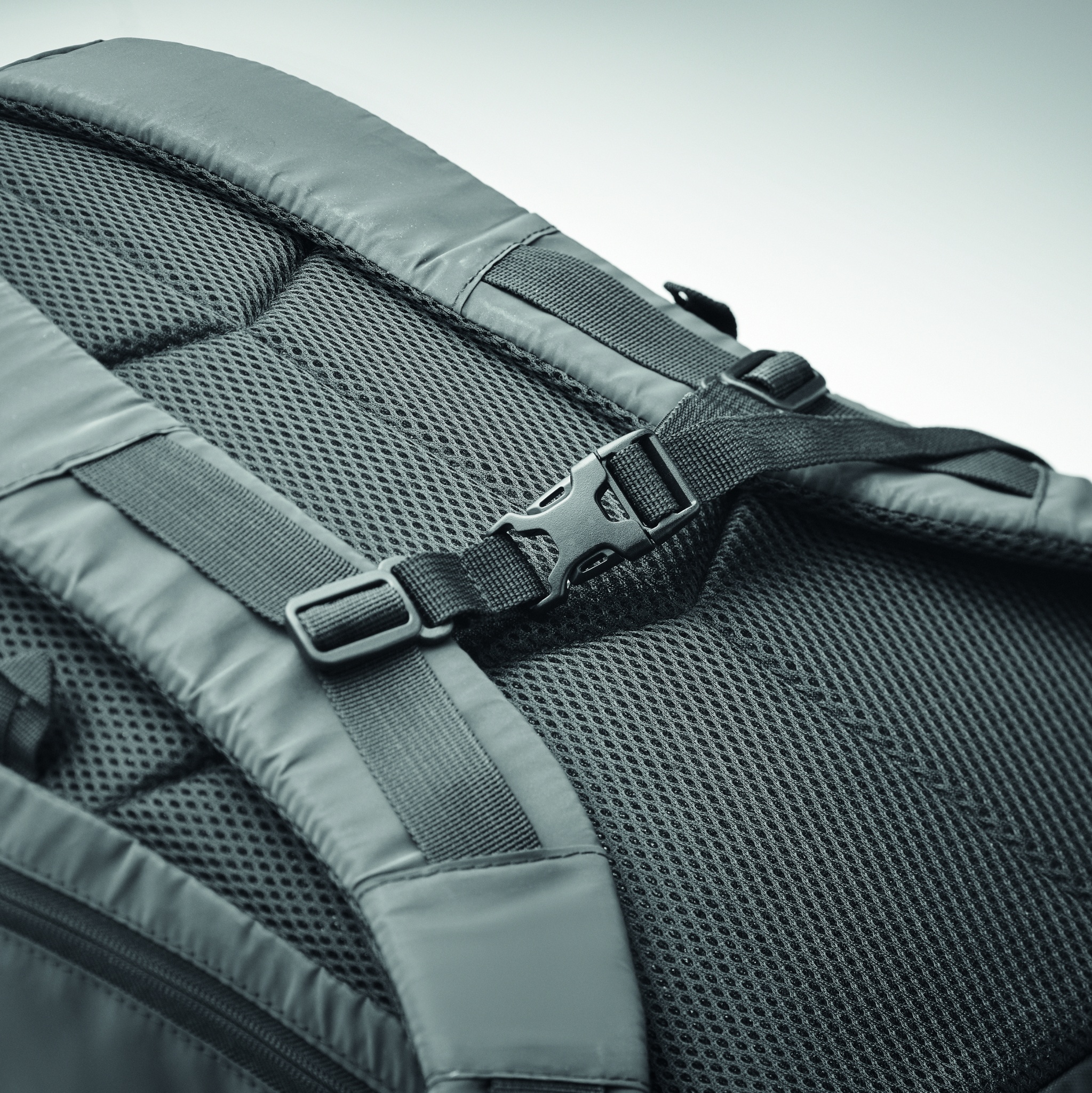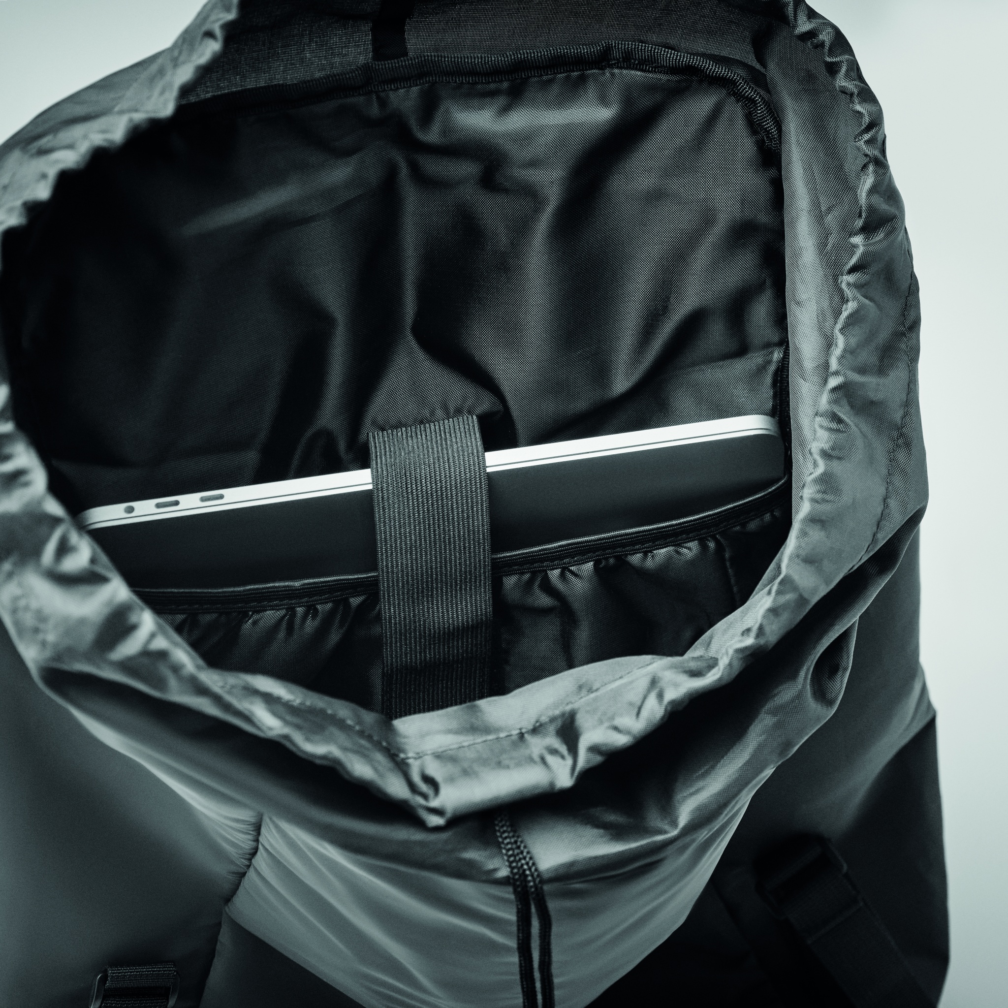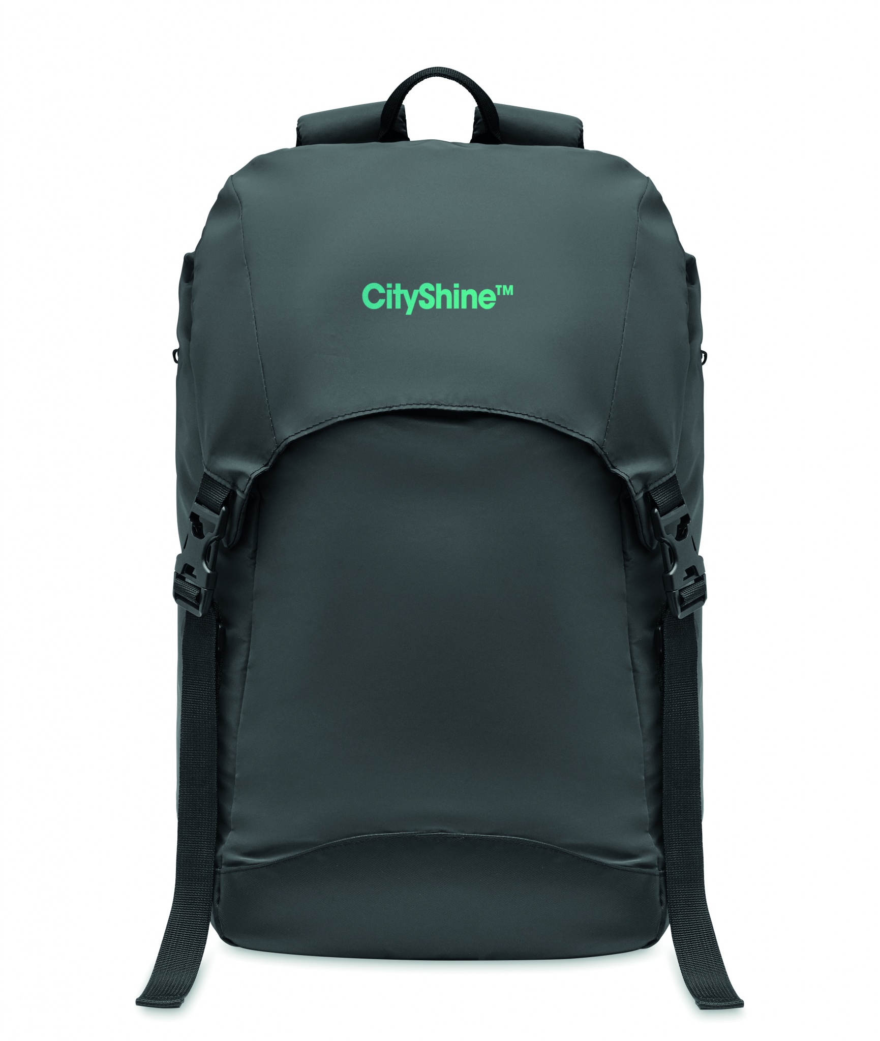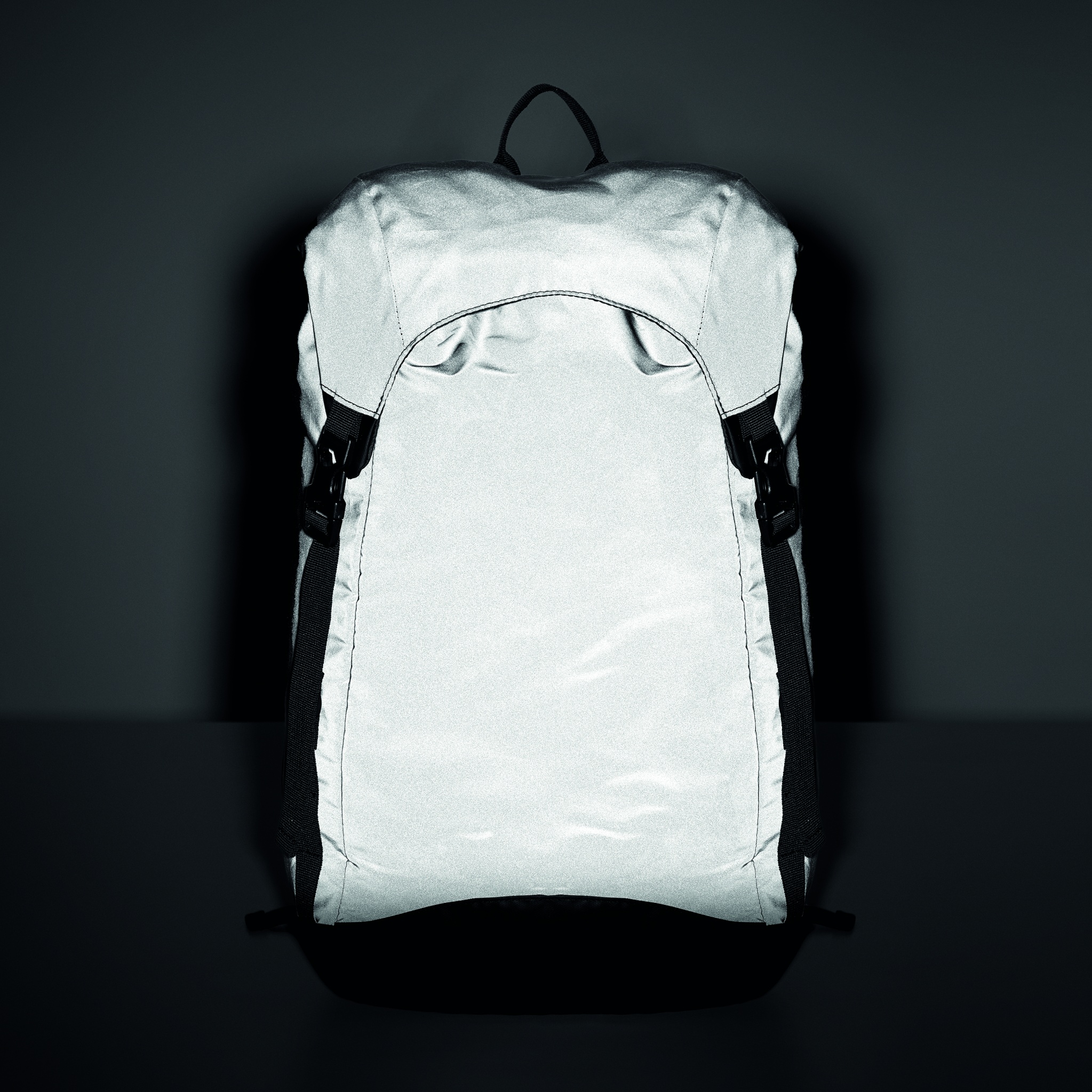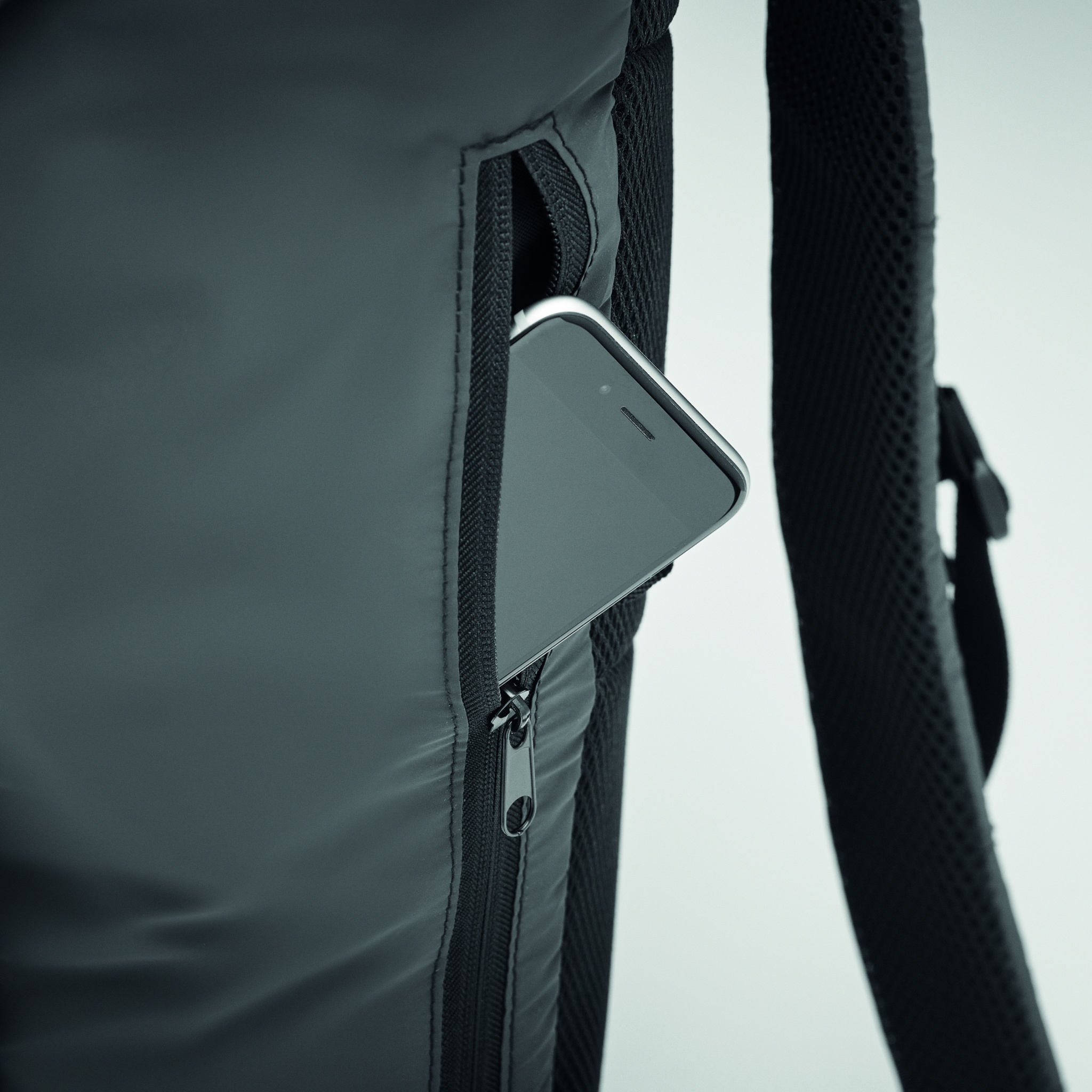 Светоотражающий рюкзак из полиэстера 190T. Боковой наружный карман на молнии и мягкая спинка, внутренняя подкладка с застежкой-шнурком. Большое внутреннее отделение для ноутбука с мягкой подкладкой. Регулируемые плечевые ремни с мягкой подкладкой, нагрудный и поясной ремни с застежкой-пряжкой. Водоотталкивающая пропитка.